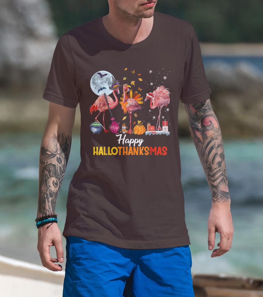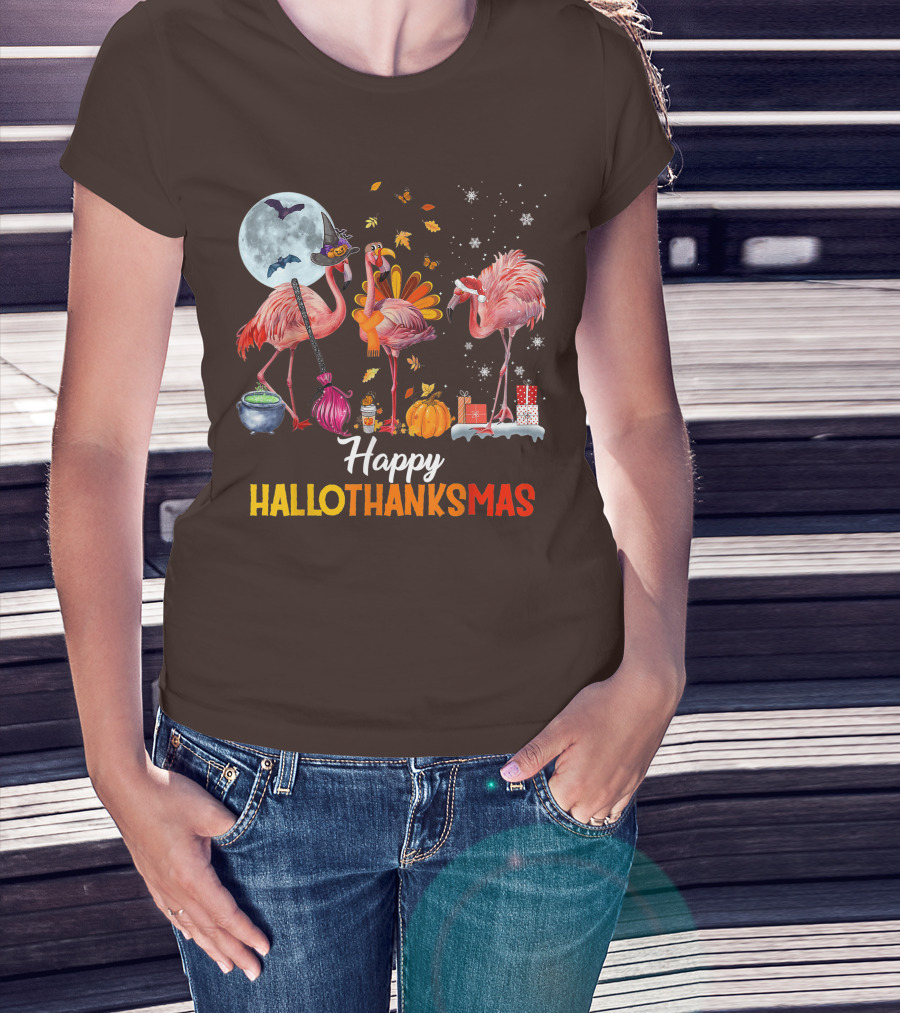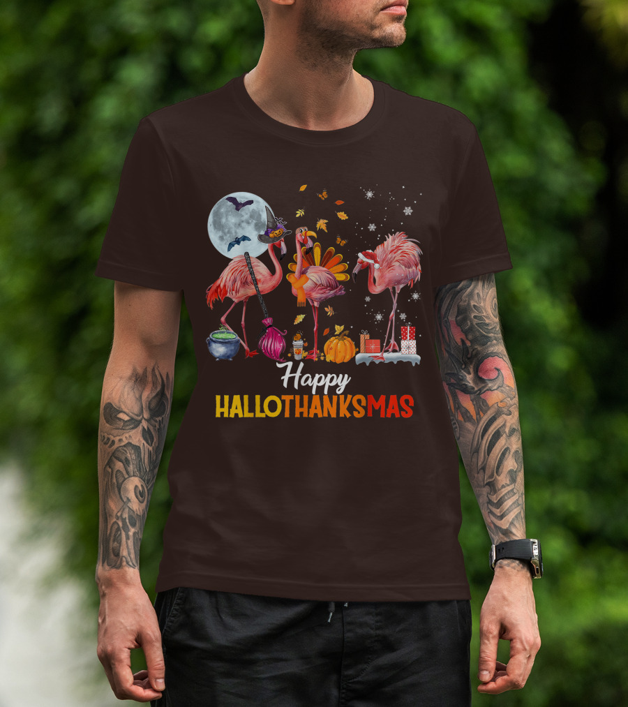 Happy Hallothanksmas Flamingo Halloween Merry Christmas T-Shirt