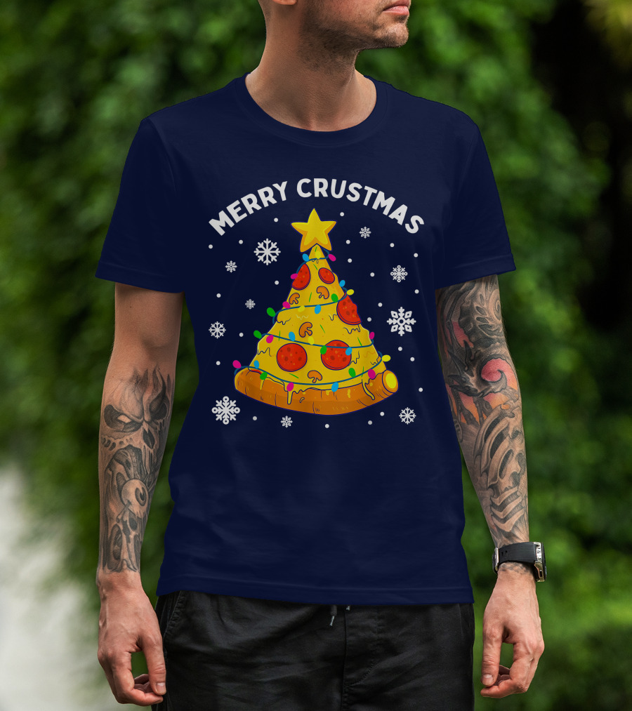 The Merry Crustmas Pizza Christmas Tree with Cheese Garland and Snowflakes T-shirt is designed for everyday wear and a consistent fit. Fabric is pre-shrunk ring-spun cotton with durable stitching. See the size chart below for exact measurements.