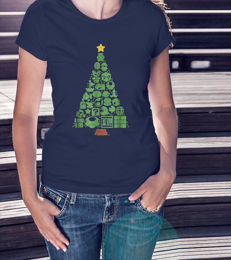 Super Mario Green Icon Christmas Tree With Star And Blocks T-Shirt
