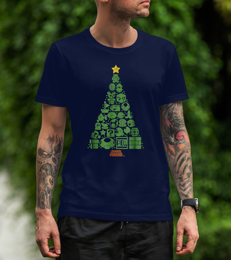 The Super Mario Green Icon Christmas Tree with Star and Blocks T-shirt is designed for everyday wear and a consistent fit. Fabric is pre-shrunk ring-spun cotton with durable stitching. See the size chart below for exact measurements.