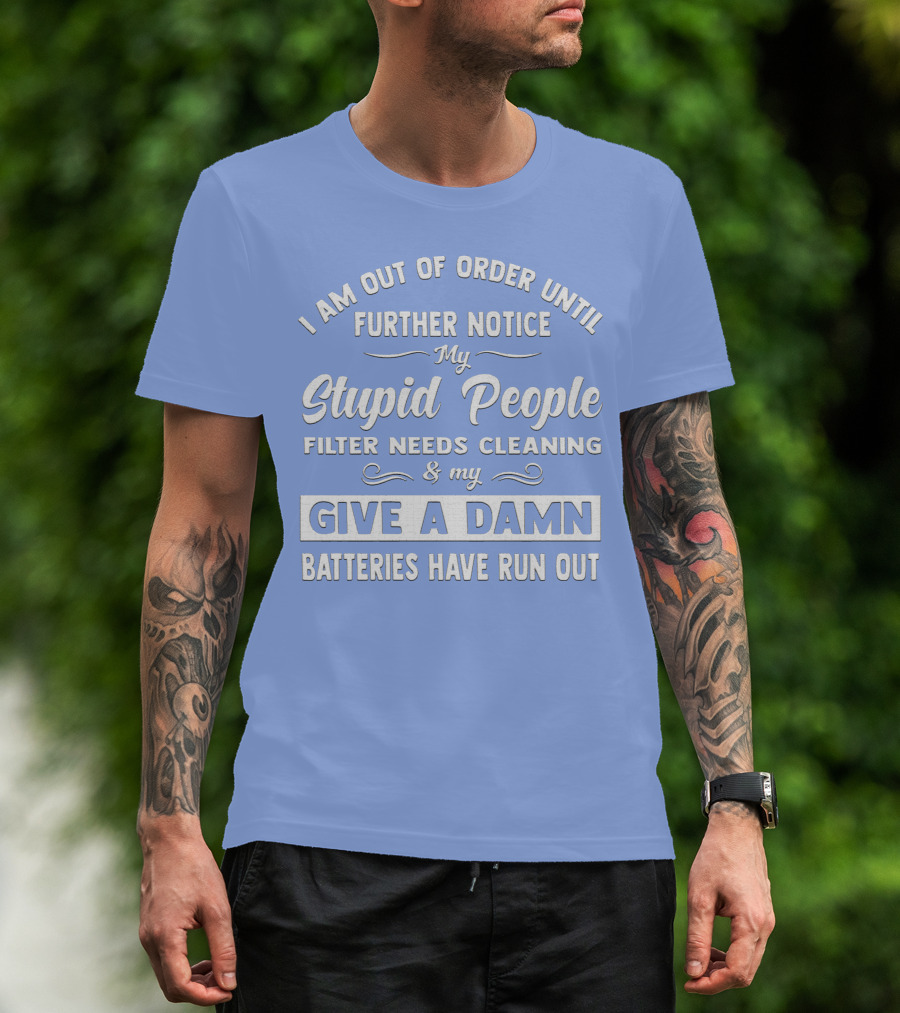 The I Am Out Of Order Until Further Notice My Stupid People Filter Needs Cleaning and My Give A Damn Batteries Have Run Out T-shirt is designed for everyday wear and a consistent fit. Fabric is pre-shrunk ring-spun cotton with durable stitching. See the size chart below for exact measurements.