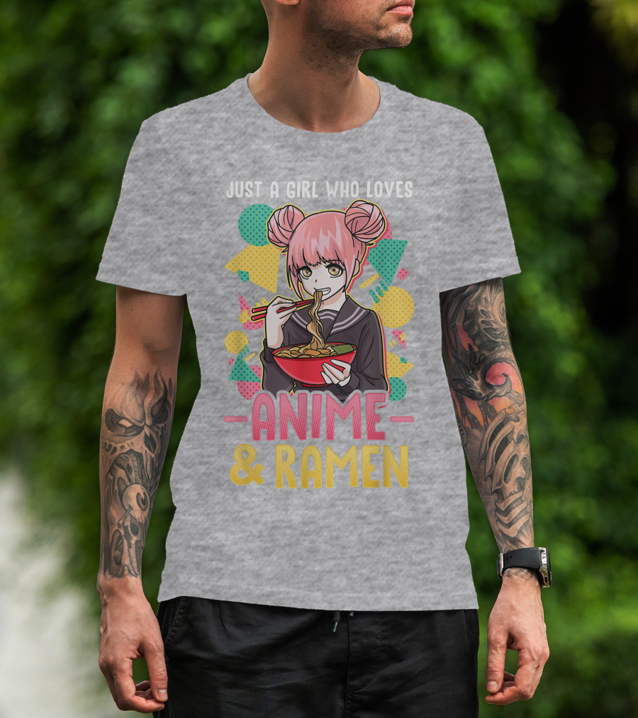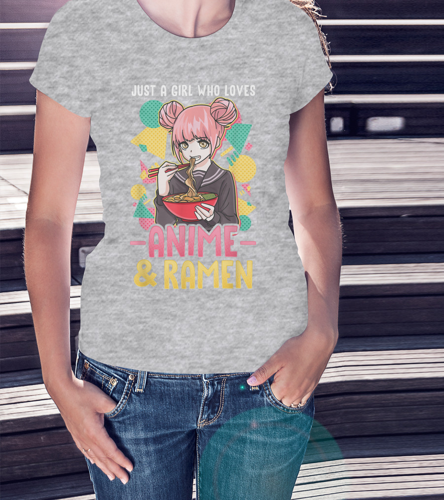 Just A Girl Who Loves Anime And Ramen With Pink-Haired Character Eating Noodles T-Shirt