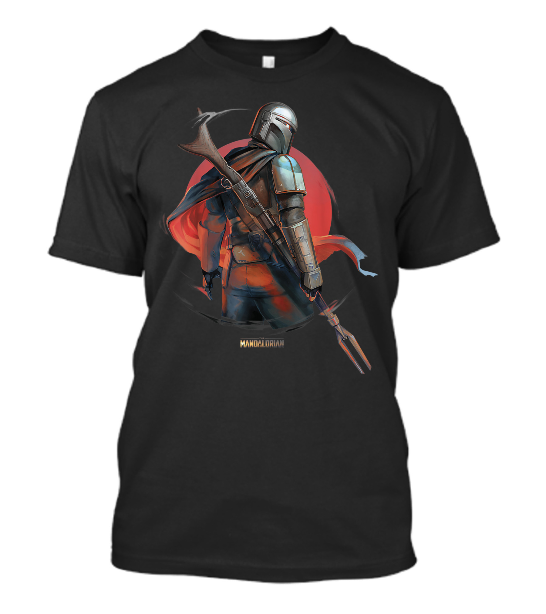 The Star Wars The Mandalorian Warrior with Blaster in Front of Red Circle T-shirt is designed for everyday wear and a consistent fit. Fabric is pre-shrunk ring-spun cotton with durable stitching. See the size chart below for exact measurements.