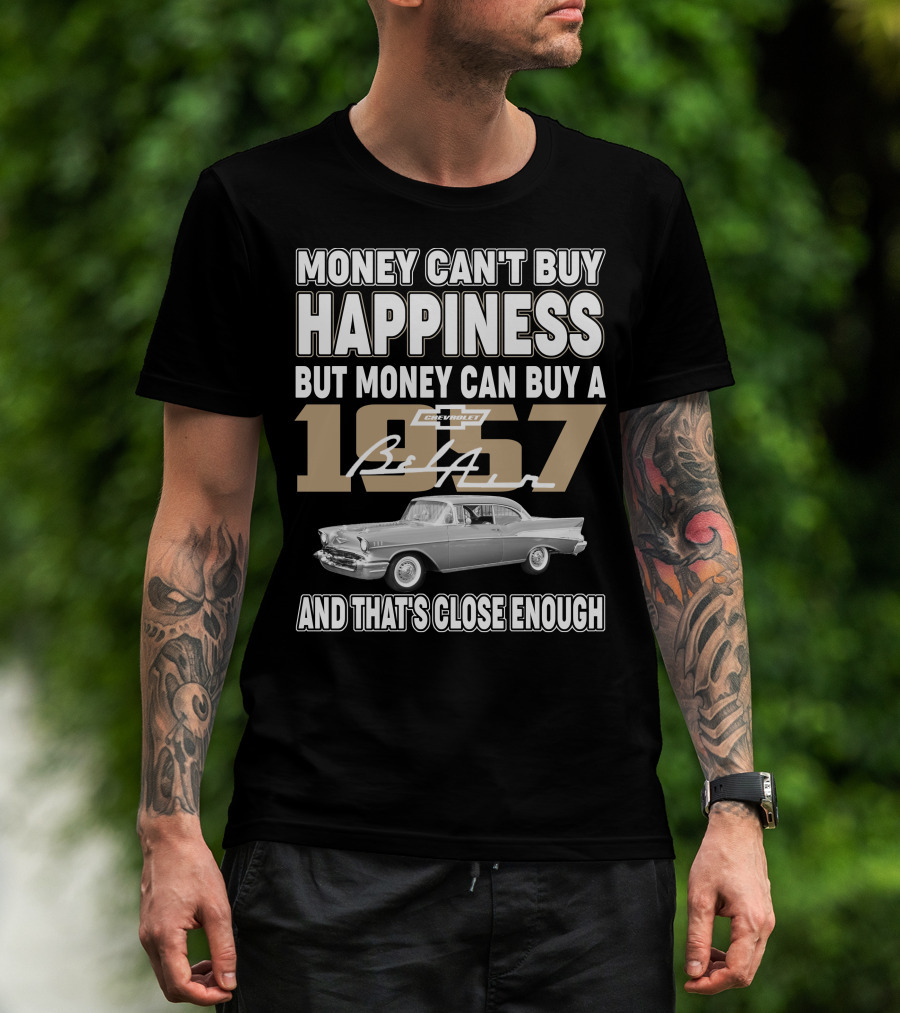 The MONEY CAN'T BUY HAPPINESS BUT MONEY CAN BUY A 1957 CHEVROLET BEL AIR AND THAT'S CLOSE ENOUGH T-shirt is designed for everyday wear and a consistent fit. Fabric is pre-shrunk ring-spun cotton with durable stitching. See the size chart below for exact measurements.