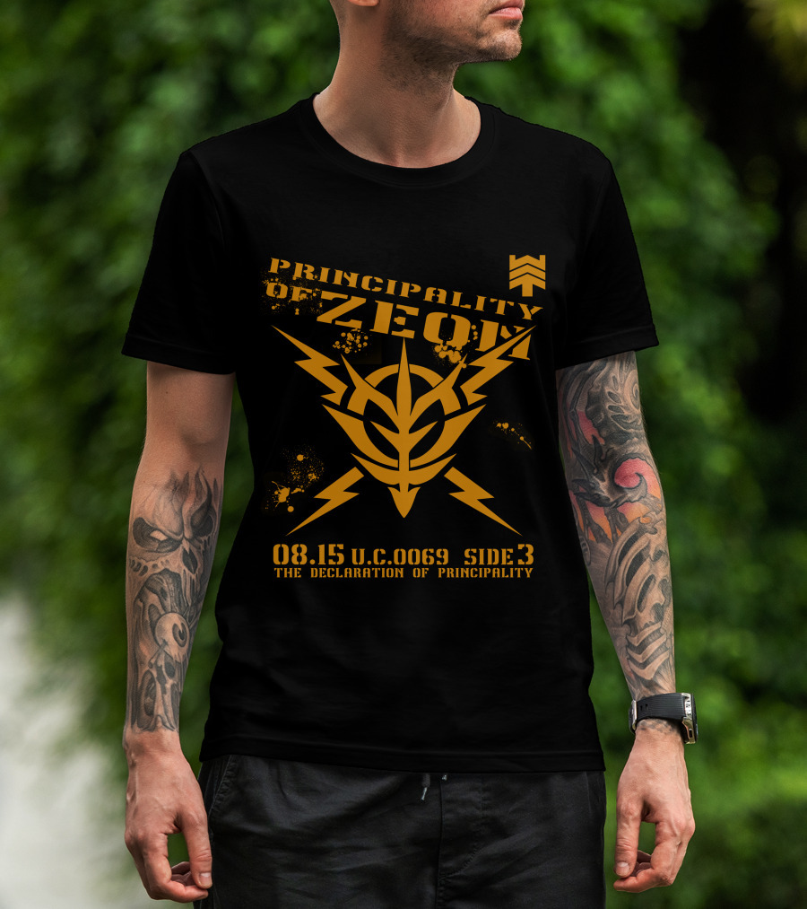 The Principality of Zeon 08.15 U.C. 0069 Side 3 The Declaration of Principality T-shirt is designed for everyday wear and a consistent fit. Fabric is pre-shrunk ring-spun cotton with durable stitching. See the size chart below for exact measurements.