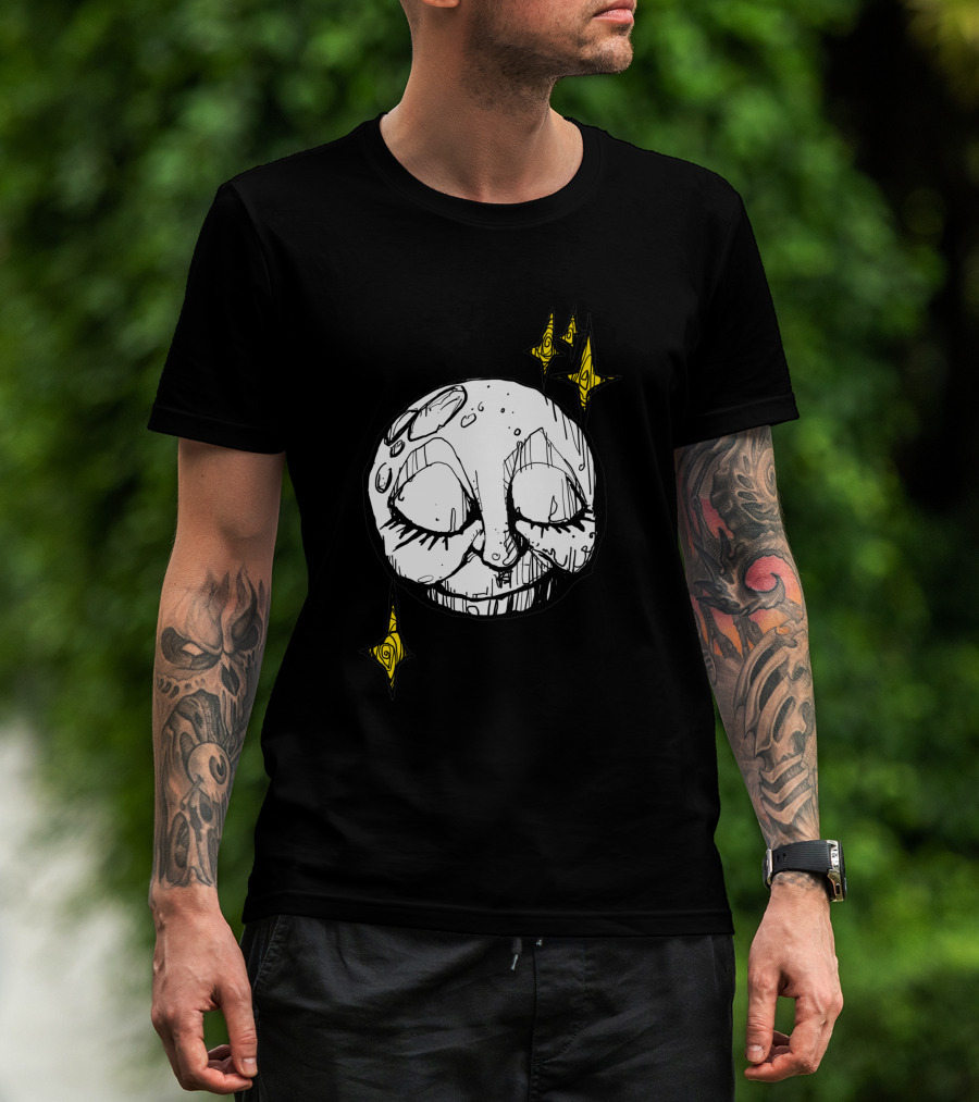 The A Tired Old Moon 1545260 Sleepy Face Dripping Wax Surrounded by Twinkling Stars T-shirt is designed for everyday wear and a consistent fit. Fabric is pre-shrunk ring-spun cotton with durable stitching. See the size chart below for exact measurements.