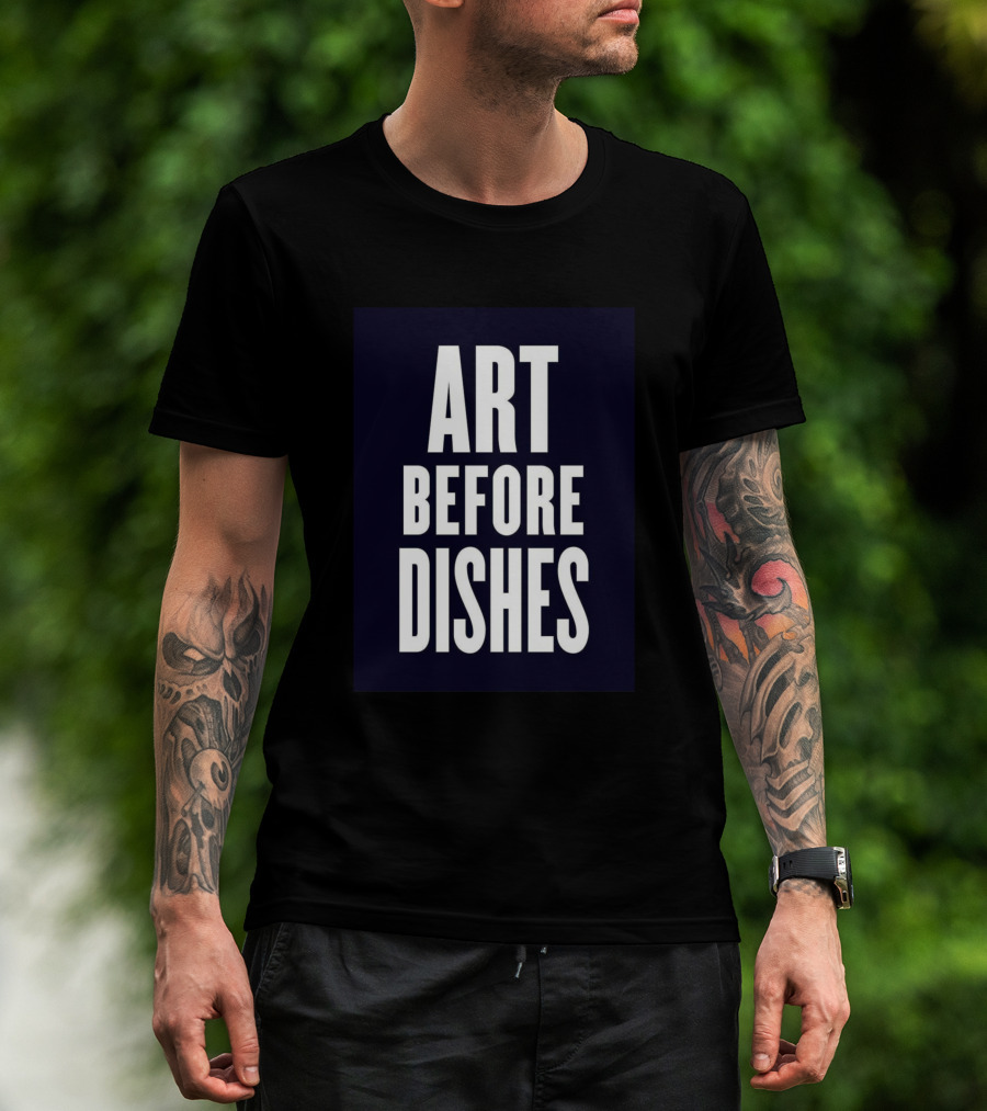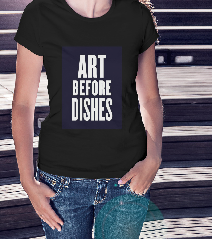 The ART BEFORE DISHES T-shirt is designed for everyday wear and a consistent fit. Fabric is pre-shrunk ring-spun cotton with durable stitching. See the size chart below for exact measurements.