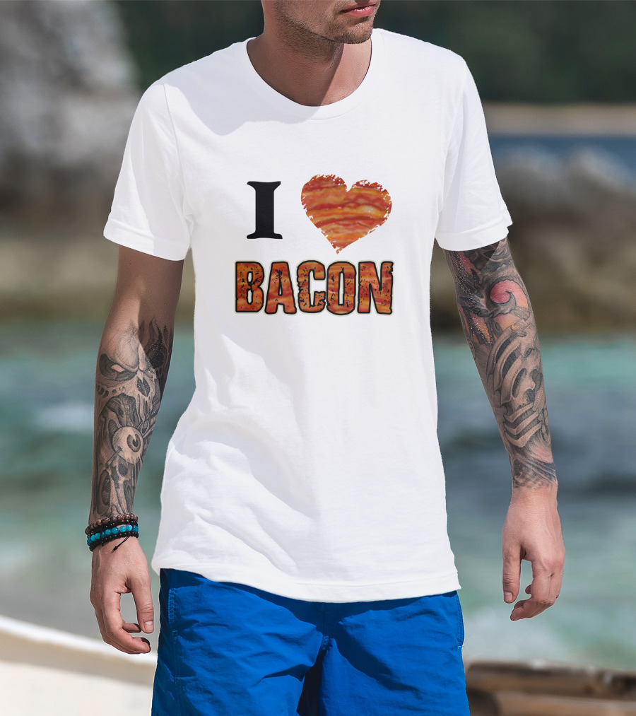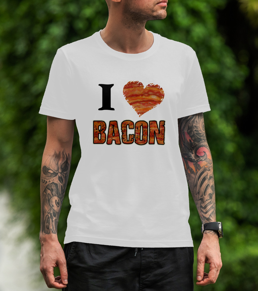 The I Heart Bacon 832704 T-shirt is designed for everyday wear and a consistent fit. Fabric is pre-shrunk ring-spun cotton with durable stitching. See the size chart below for exact measurements.