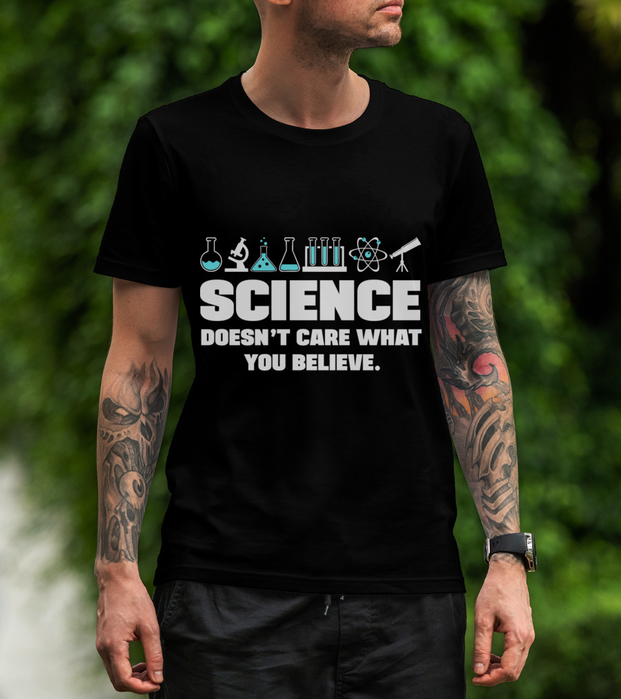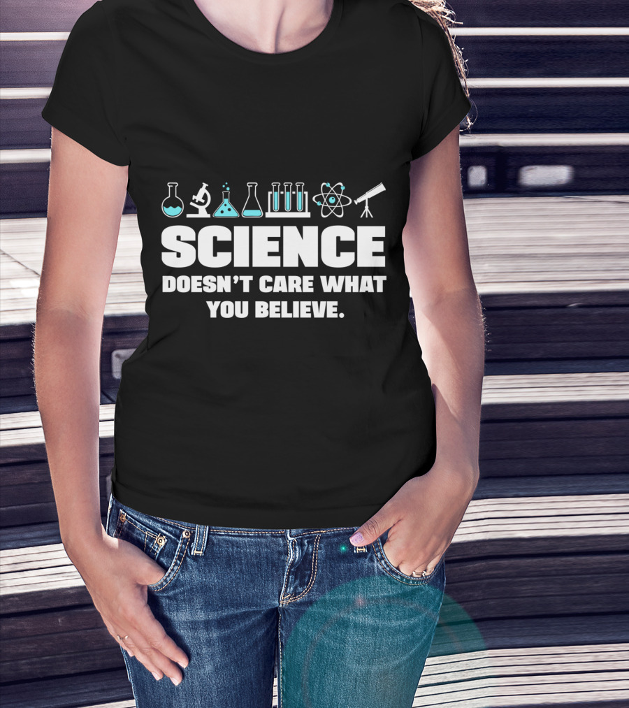 The Science Doesn't Care What You Believe T-shirt is designed for everyday wear and a consistent fit. Fabric is pre-shrunk ring-spun cotton with durable stitching. See the size chart below for exact measurements.