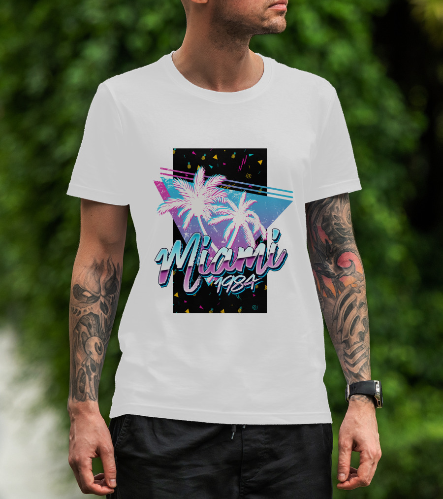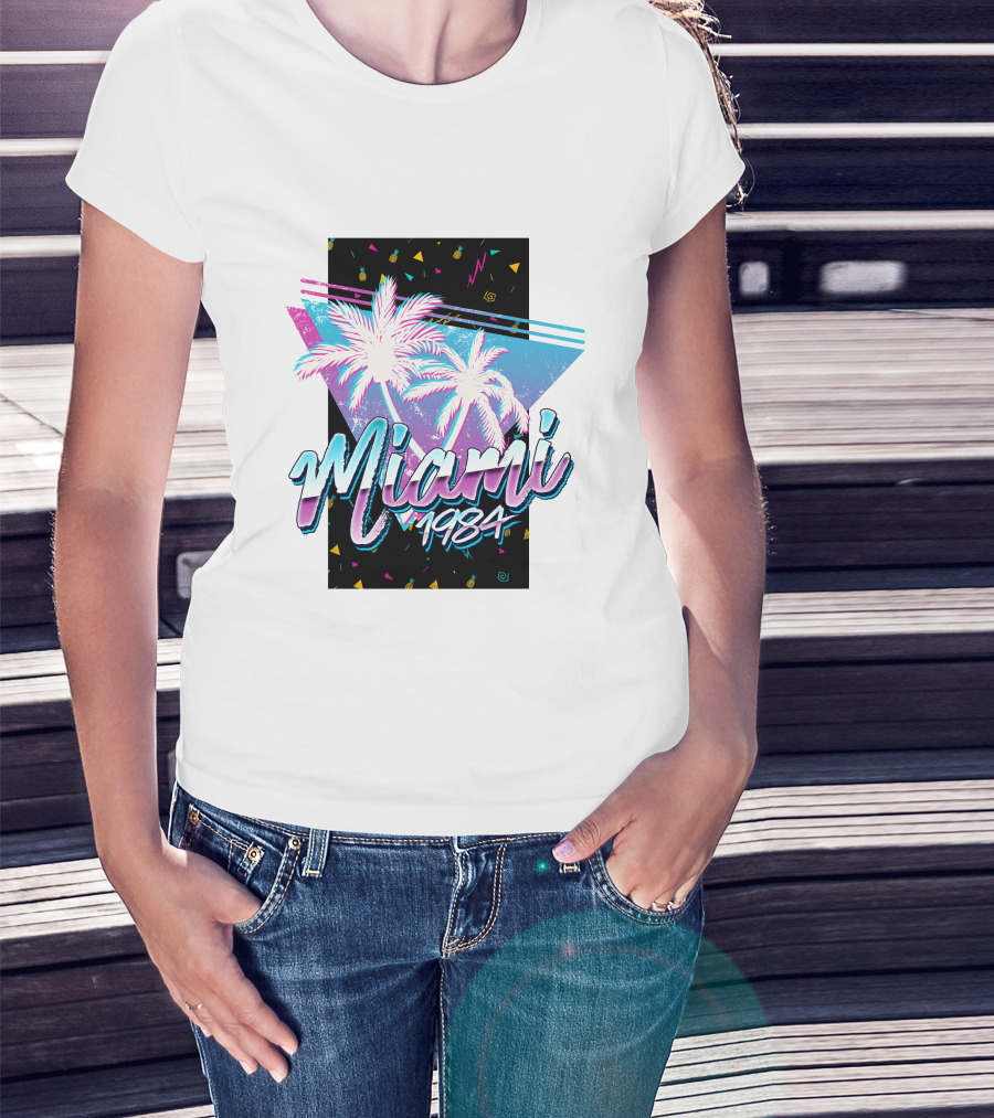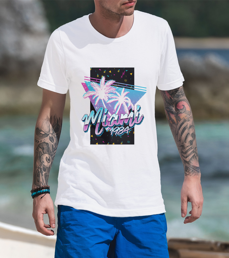 The Miami 1984 Retro Palm Trees Neon Abstract T-shirt is designed for everyday wear and a consistent fit. Fabric is pre-shrunk ring-spun cotton with durable stitching. See the size chart below for exact measurements.
