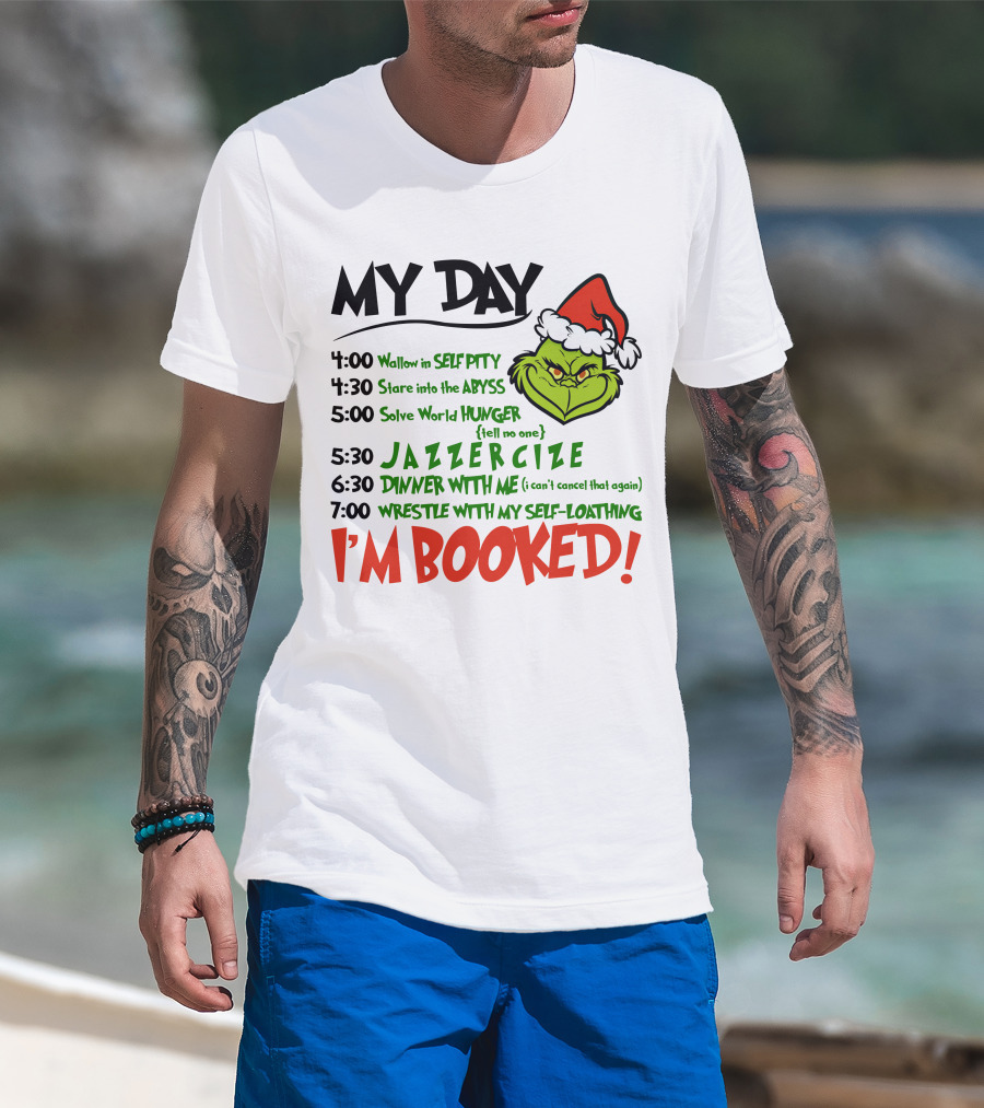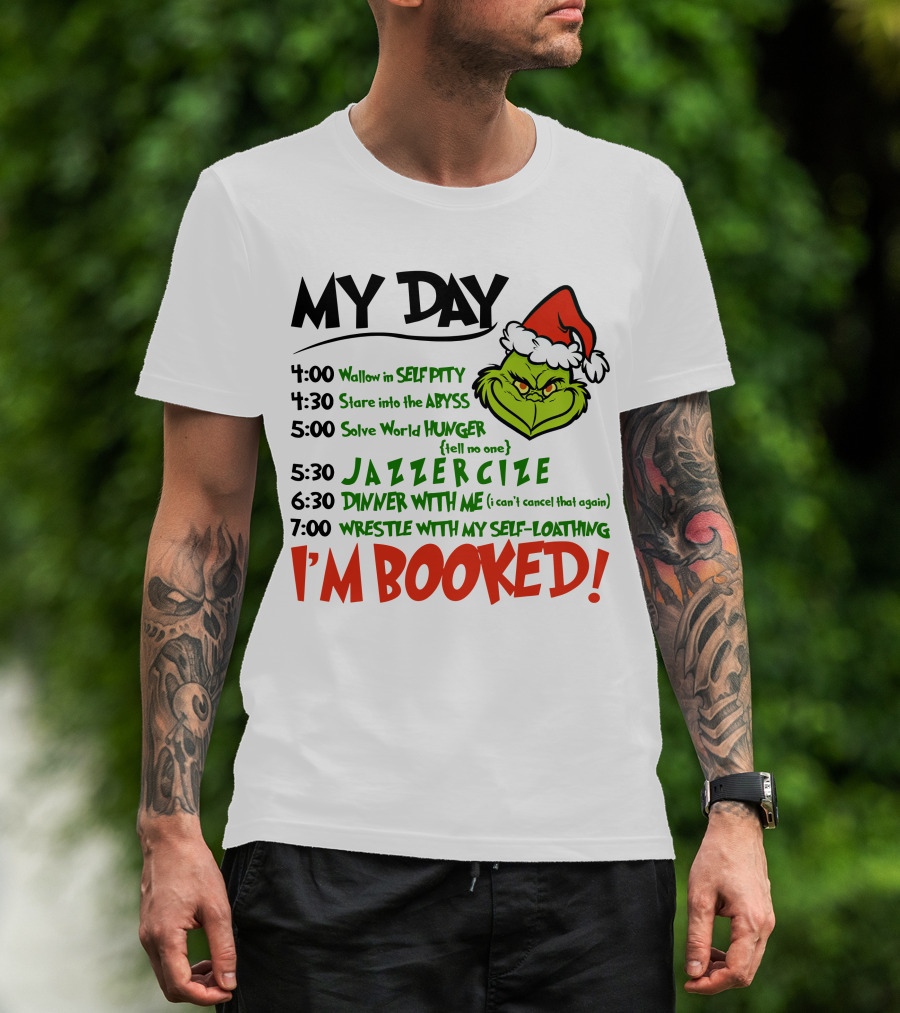 The Grinch My Day Schedule I'm Booked with Jazzercise Self-Pity Abyss T-shirt is designed for everyday wear and a consistent fit. Fabric is pre-shrunk ring-spun cotton with durable stitching. See the size chart below for exact measurements.