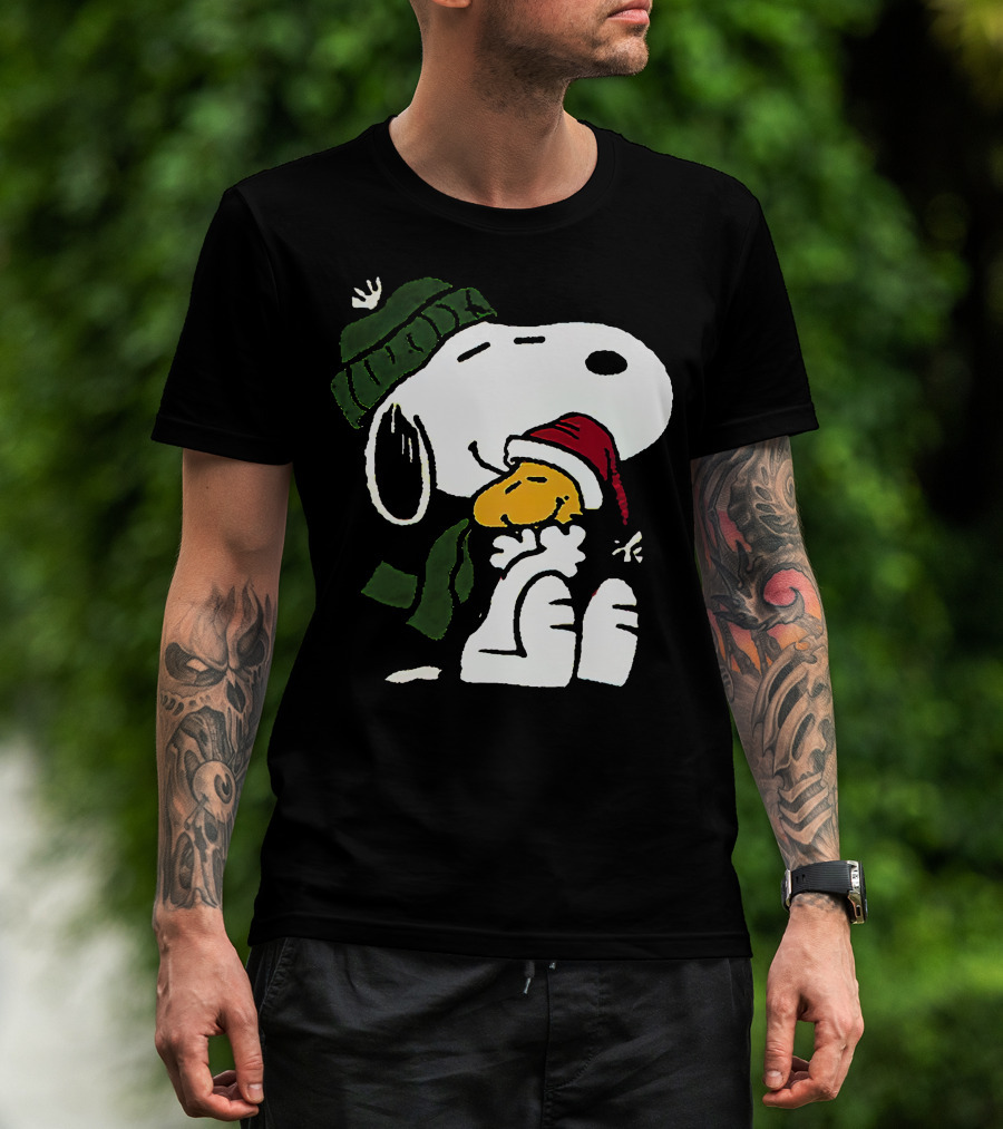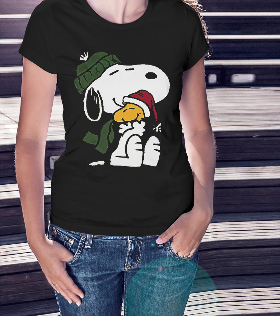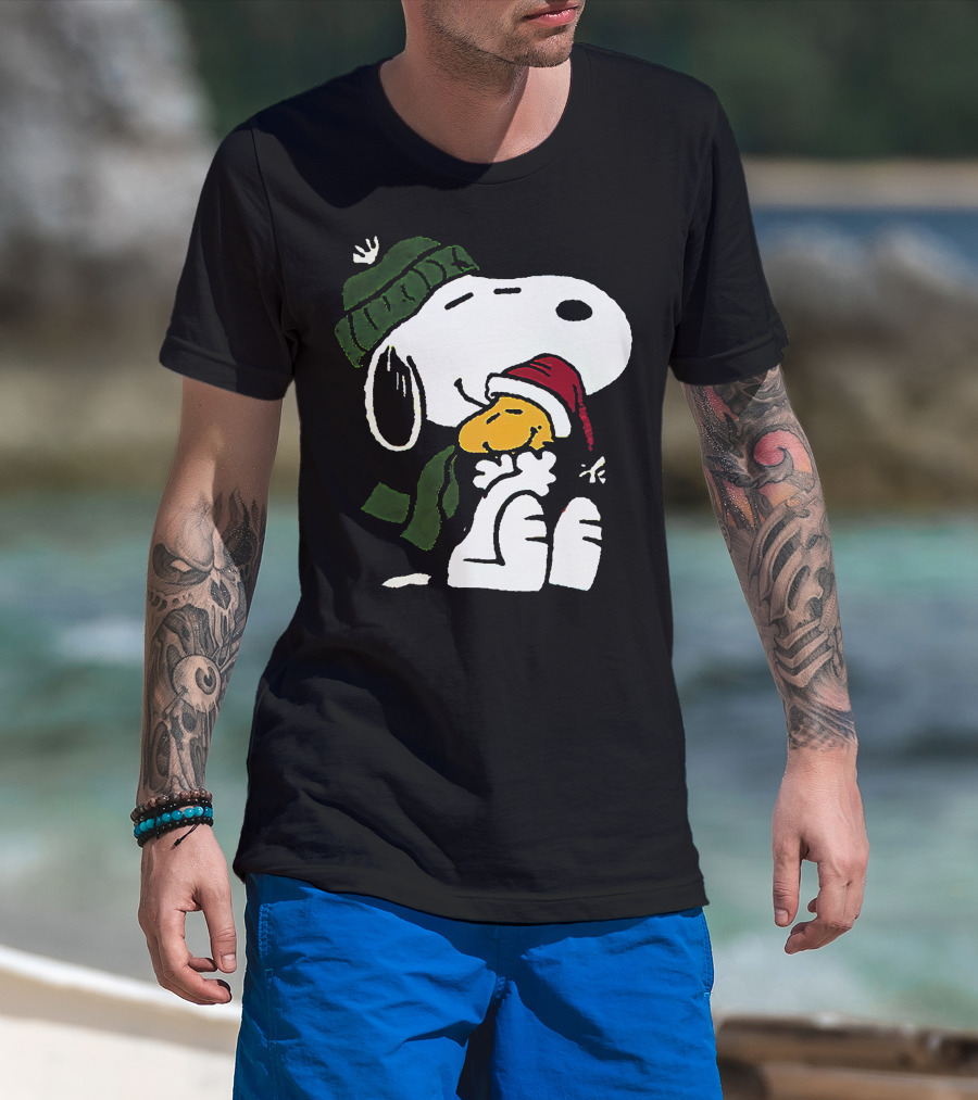Snoopy Hugging Woodstock Winter Hat Scarf Christmas T-Shirt