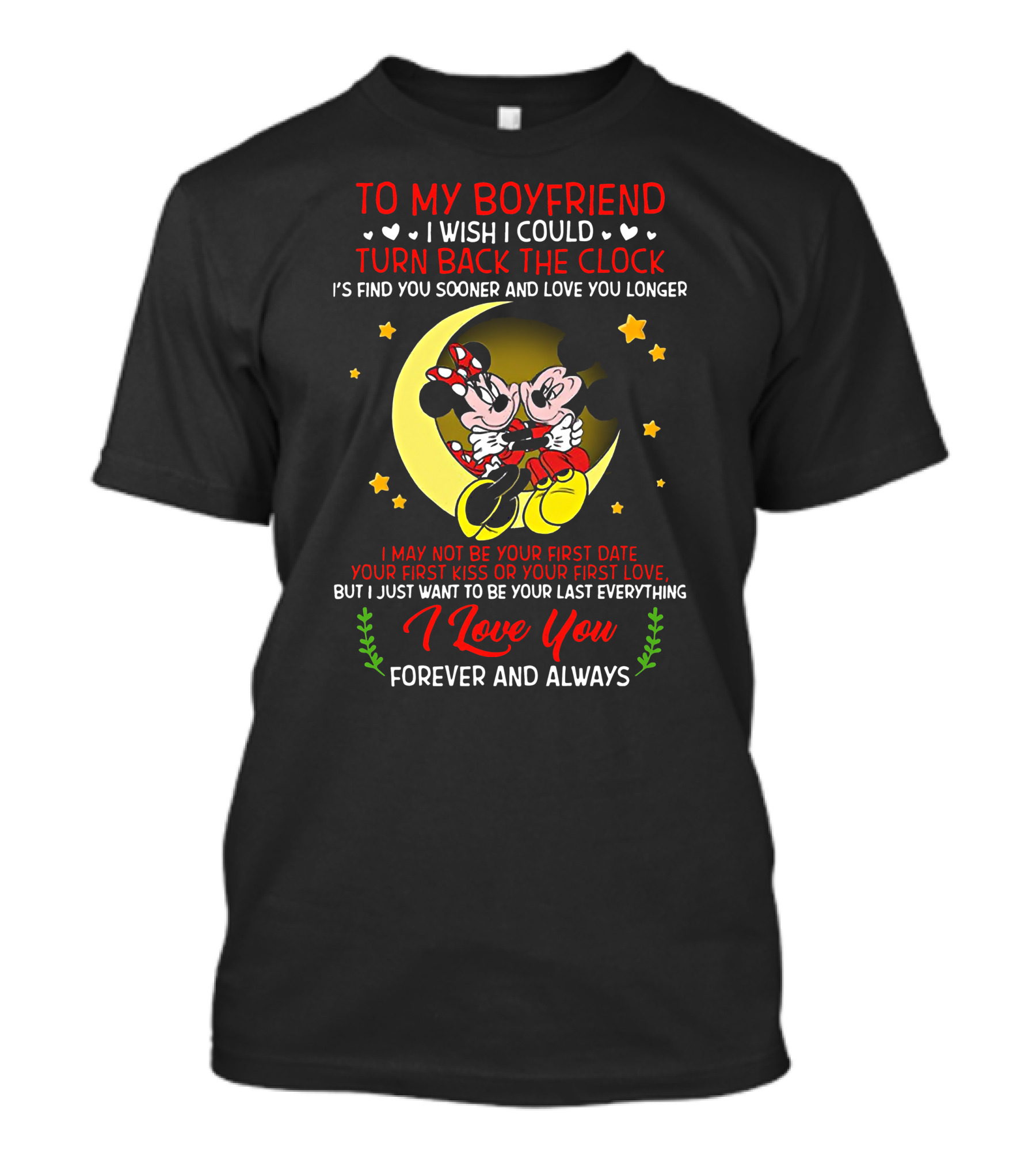 The To My Boyfriend I Love You Forever and Always Mickey Mouse and Minnie Mouse I Wish I Could Turn Back the Clock T-shirt is designed for everyday wear and a consistent fit. Fabric is pre-shrunk ring-spun cotton with durable stitching. See the size chart below for exact measurements.