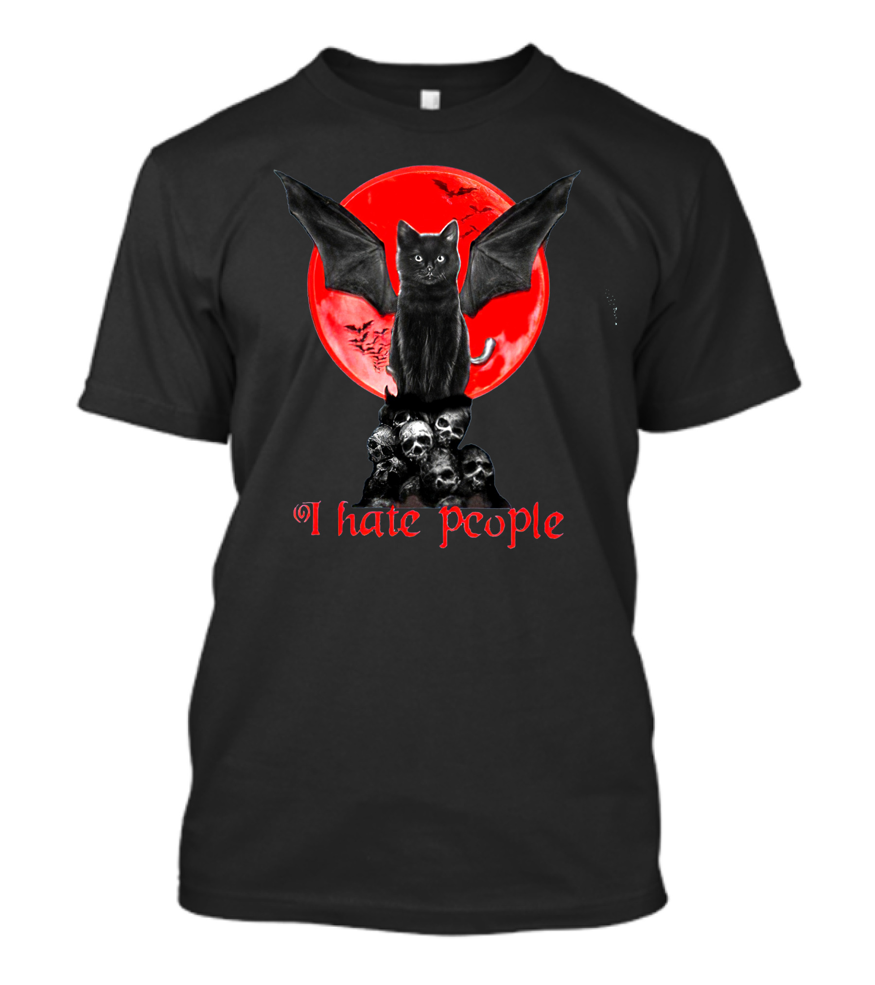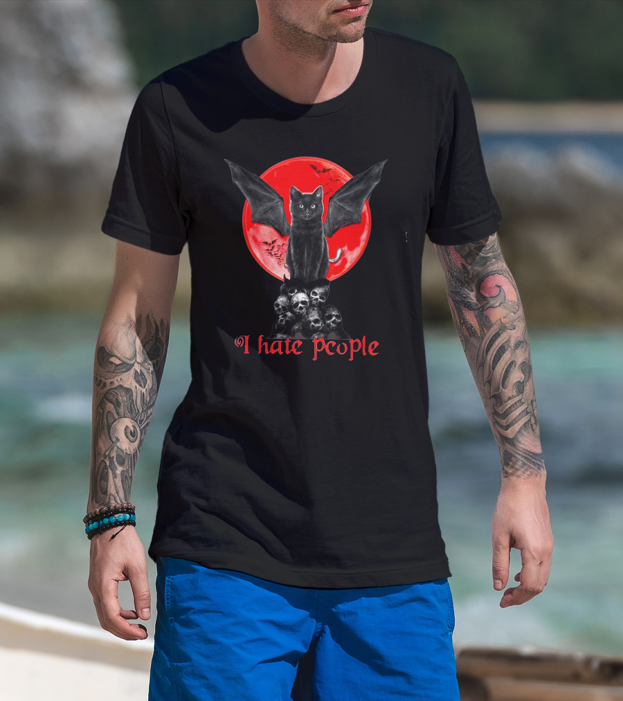 I Hate People Black Cat Bat Wings Skulls Red Moon T-Shirt