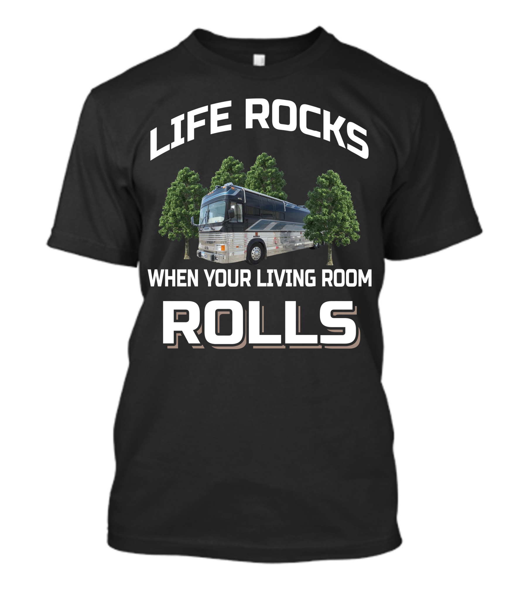 LIFE ROCKS WHEN YOUR LIVING ROOM ROLLS 1993 LIBERTY PREVOST CONVERSION BUS T-Shirt