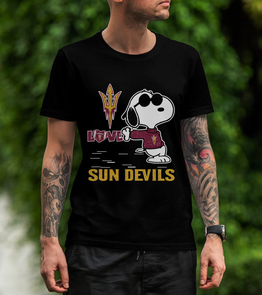 The Snoopy Love Sun Devils T-shirt is designed for everyday wear and a consistent fit. Fabric is pre-shrunk ring-spun cotton with durable stitching. See the size chart below for exact measurements.