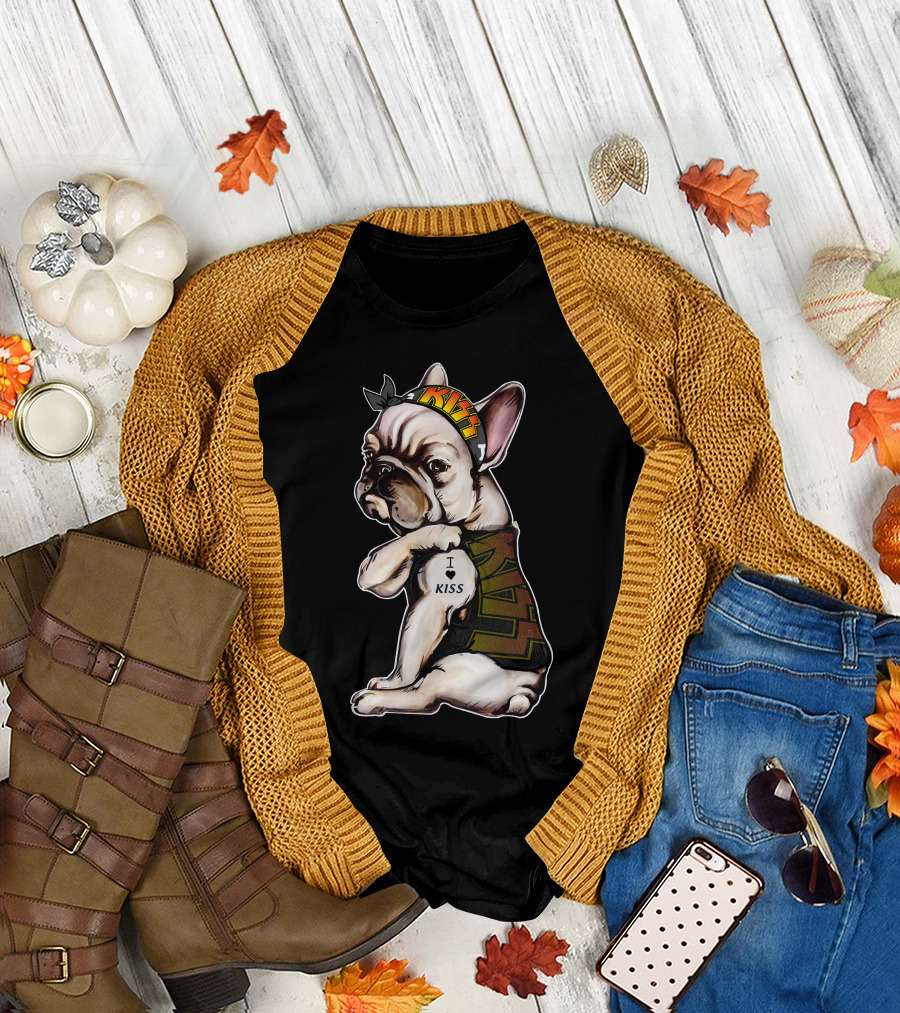 The I Heart KISS French Bulldog Bandana T-shirt is designed for everyday wear and a consistent fit. Fabric is pre-shrunk ring-spun cotton with durable stitching. See the size chart below for exact measurements.