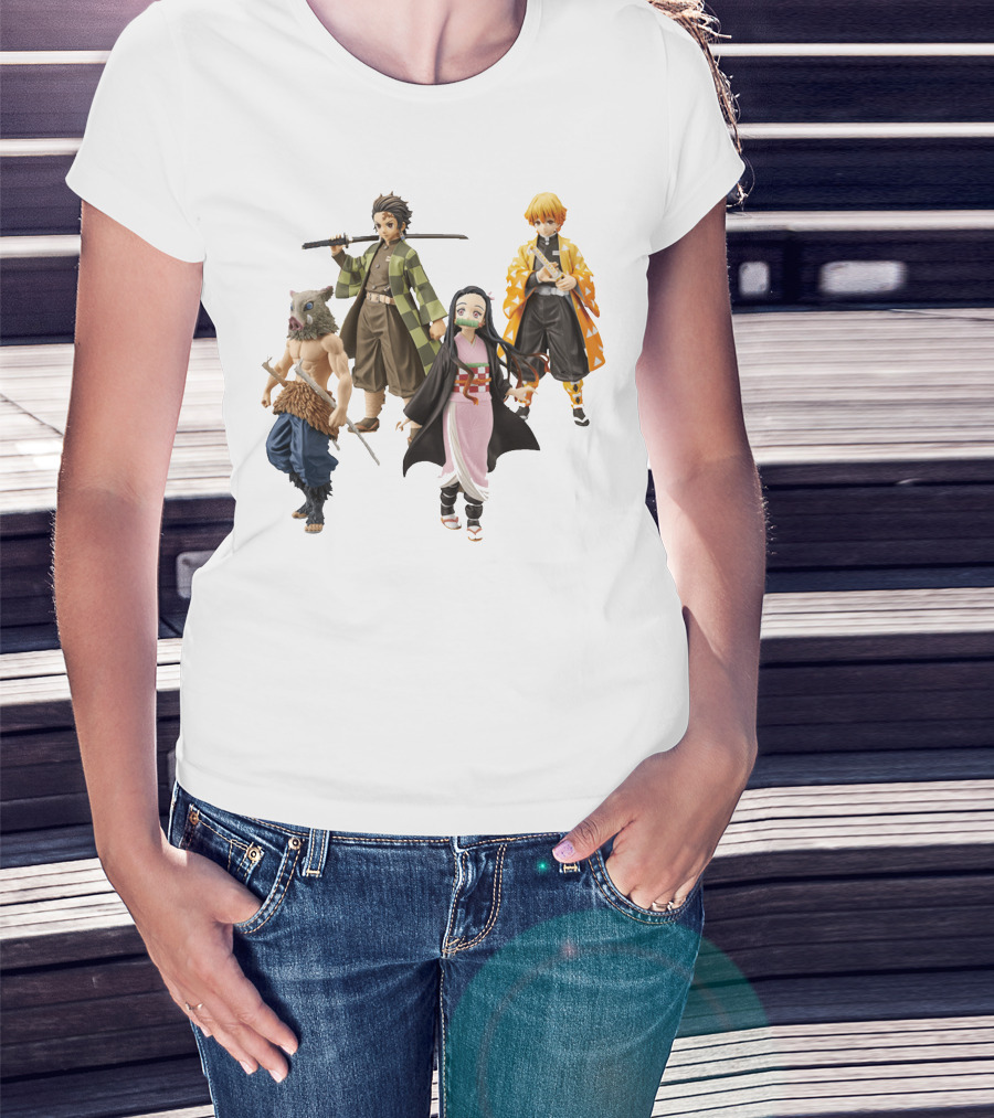 The Demon Slayer Tanjiro Nezuko Zenitsu Inosuke Figures T-shirt is designed for everyday wear and a consistent fit. Fabric is pre-shrunk ring-spun cotton with durable stitching. See the size chart below for exact measurements.