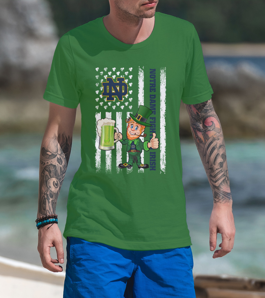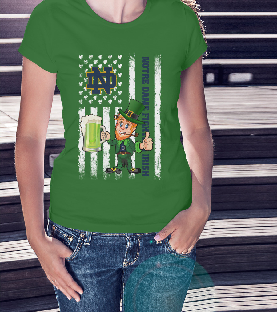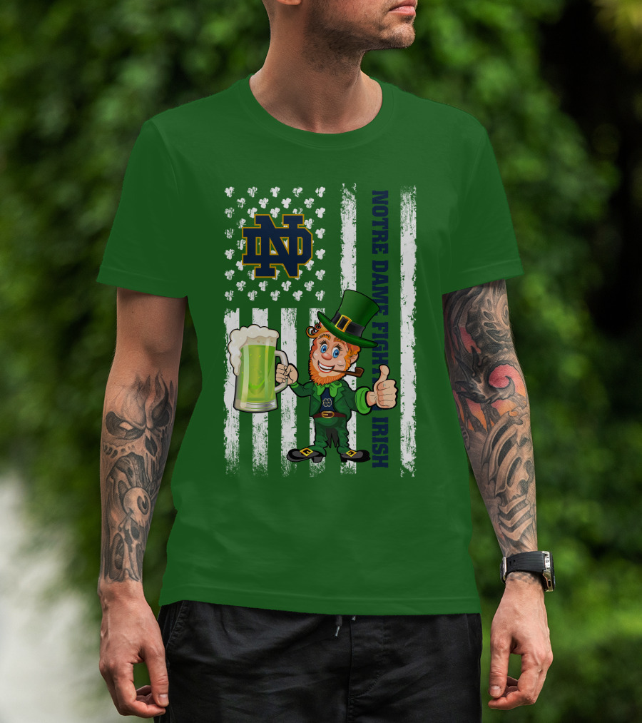 Notre Dame Fighting Irish Leprechaun With Beer And Shamrock Flag T-Shirt
