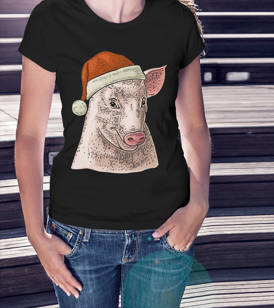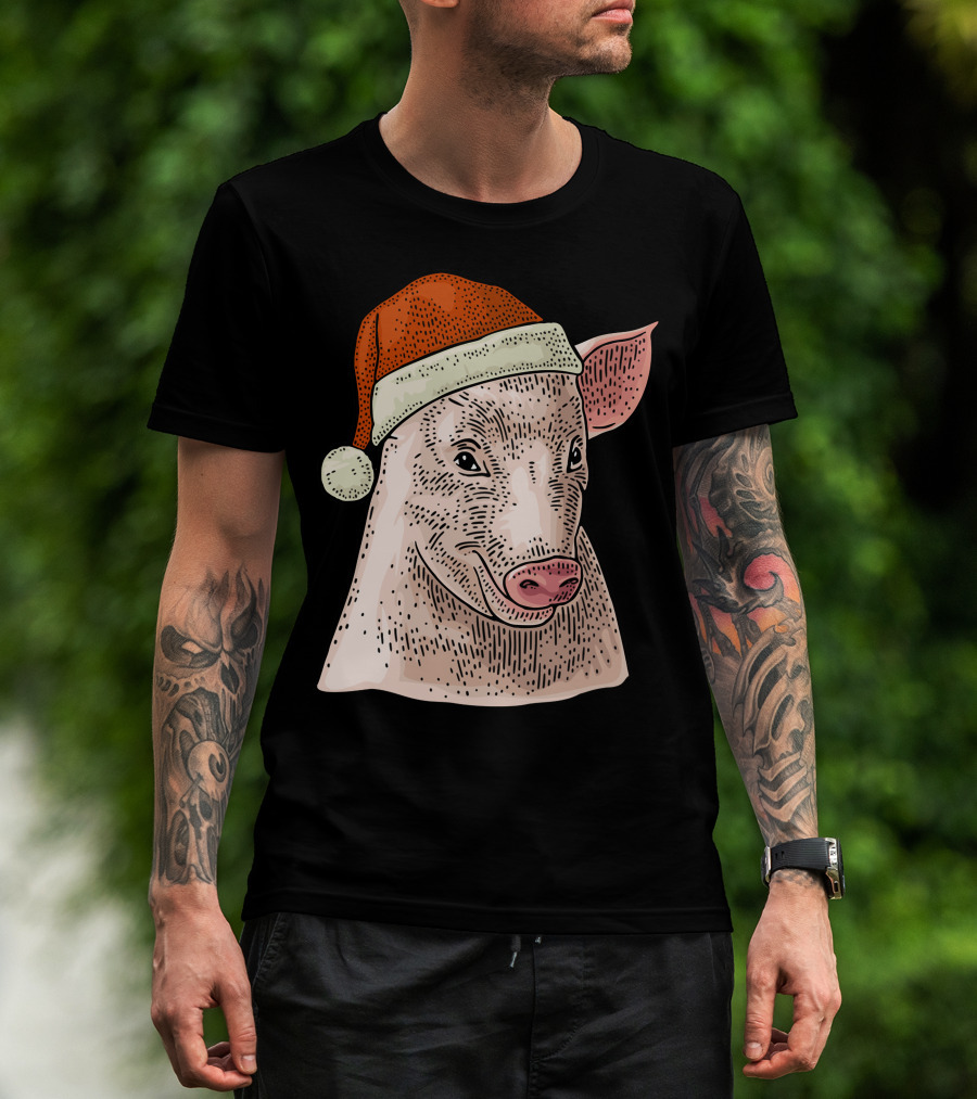 The Pig in Santa Claus Cap Christmas T-shirt is designed for everyday wear and a consistent fit. Fabric is pre-shrunk ring-spun cotton with durable stitching. See the size chart below for exact measurements.