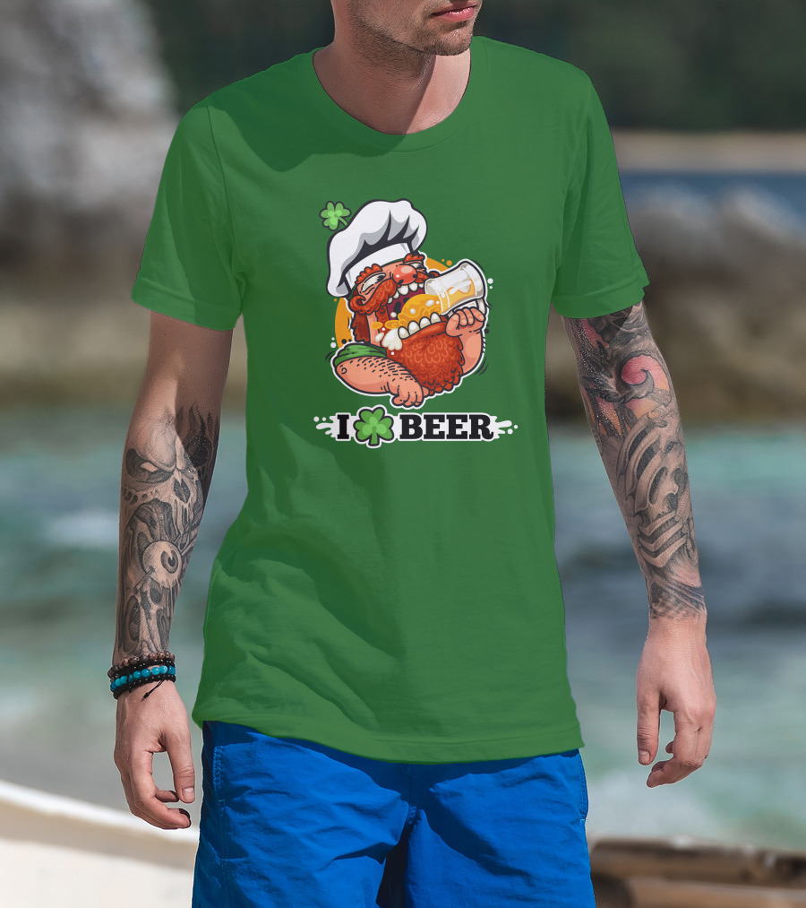 The Irish Chef Shamrock I Love Beer T-shirt is designed for everyday wear and a consistent fit. Fabric is pre-shrunk ring-spun cotton with durable stitching. See the size chart below for exact measurements.