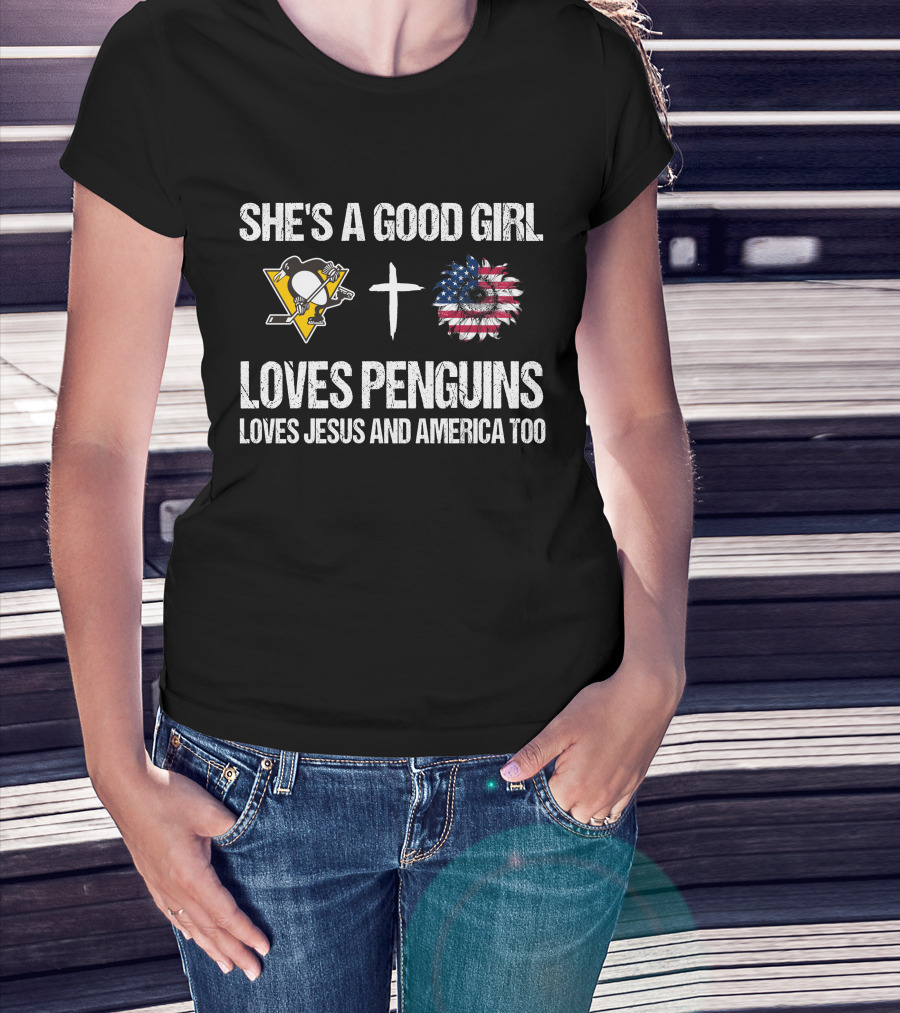 She's A Good Girl Penguins Logo Cross American Flag Loves Penguins Loves Jesus And America Too T-Shirt