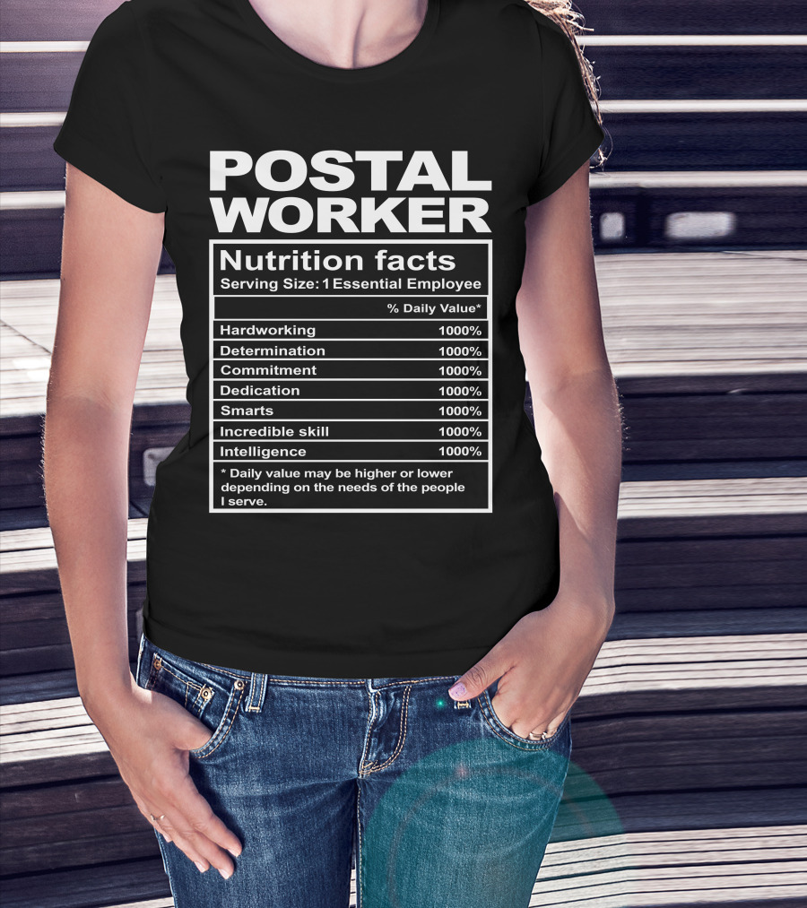 The POSTAL WORKER NUTRITION FACTS HARDWORKING DETERMINATION COMMITMENT DEDICATION SMARTS INCREDIBLE SKILL INTELLIGENCE T-shirt is designed for everyday wear and a consistent fit. Fabric is pre-shrunk ring-spun cotton with durable stitching. See the size chart below for exact measurements.