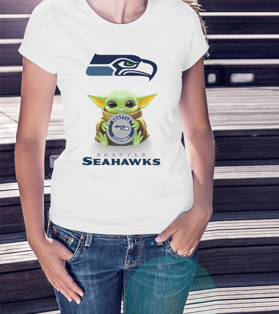 Baby Yoda Seattle Seahawks Hugging Logo With Team Name T-Shirt