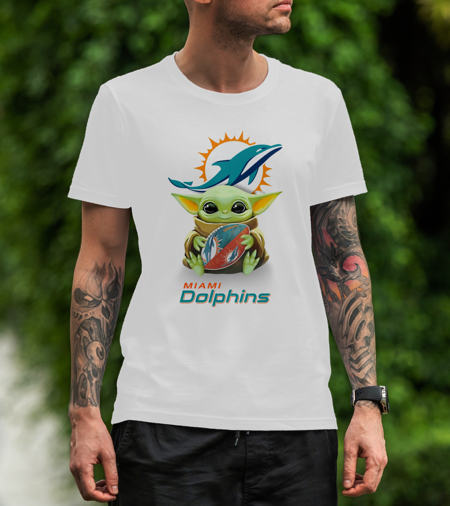 The Star Wars Baby Yoda Hug Miami Dolphins Football Tailgate White T-shirt is designed for everyday wear and a consistent fit. Fabric is pre-shrunk ring-spun cotton with durable stitching. See the size chart below for exact measurements.