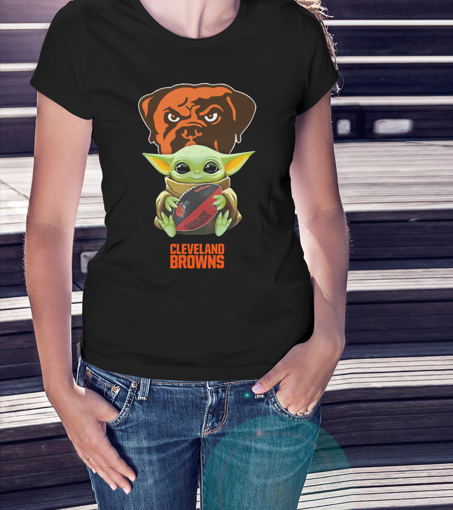 Grogu Hugging Football With Cleveland Browns Logo Tailgate T-Shirt