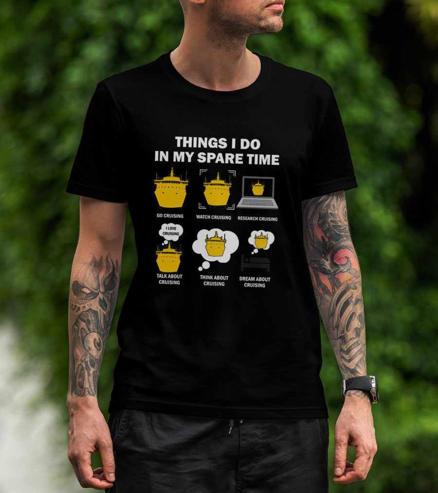 The Things I Do in My Spare Time Go Watch Research Talk Think Dream About Cruising T-shirt is designed for everyday wear and a consistent fit. Fabric is pre-shrunk ring-spun cotton with durable stitching. See the size chart below for exact measurements.
