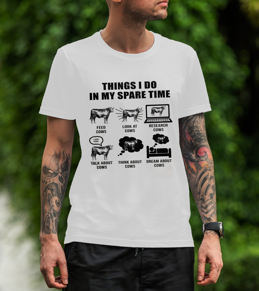 The Things I Do In My Spare Time Feed Cows Look At Cows Research Cows Talk About Cows Think About Cows Dream About Cows T-shirt is designed for everyday wear and a consistent fit. Fabric is pre-shrunk ring-spun cotton with durable stitching. See the size chart below for exact measurements.