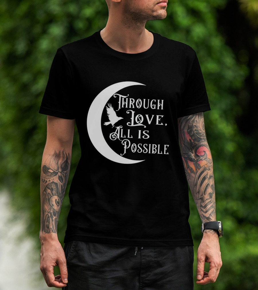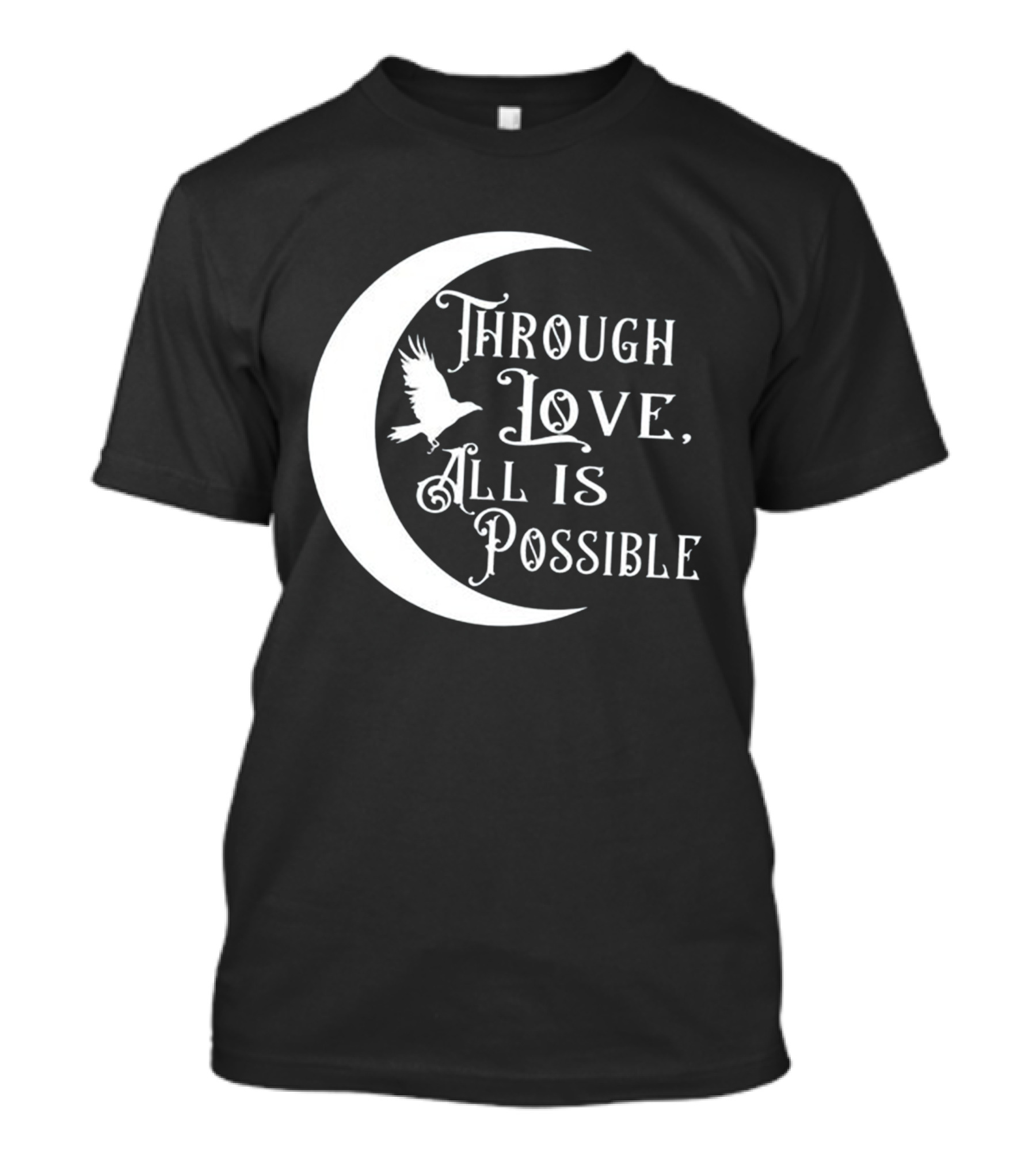 The Through Love All Is Possible Moon and Bird T-shirt is designed for everyday wear and a consistent fit. Fabric is pre-shrunk ring-spun cotton with durable stitching. See the size chart below for exact measurements.