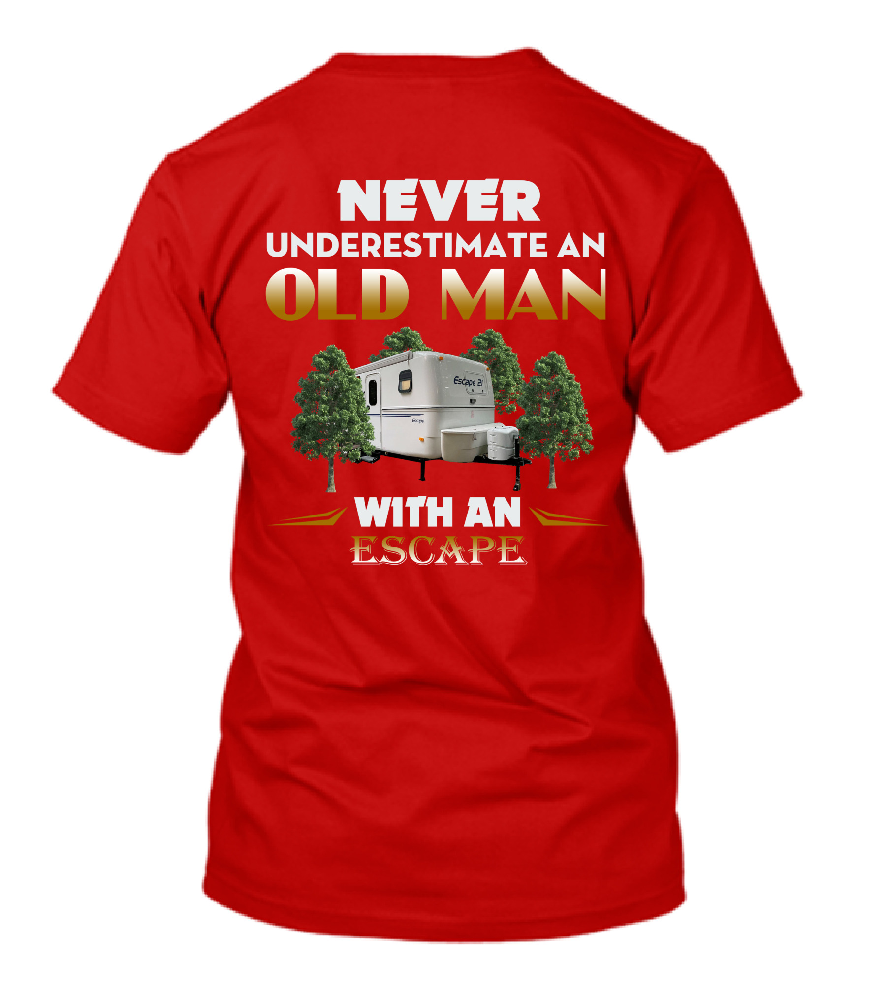 The NEVER UNDERESTIMATE AN OLD MAN WITH AN ESCAPE 21 CAMPER T-shirt is designed for everyday wear and a consistent fit. Fabric is pre-shrunk ring-spun cotton with durable stitching. See the size chart below for exact measurements.