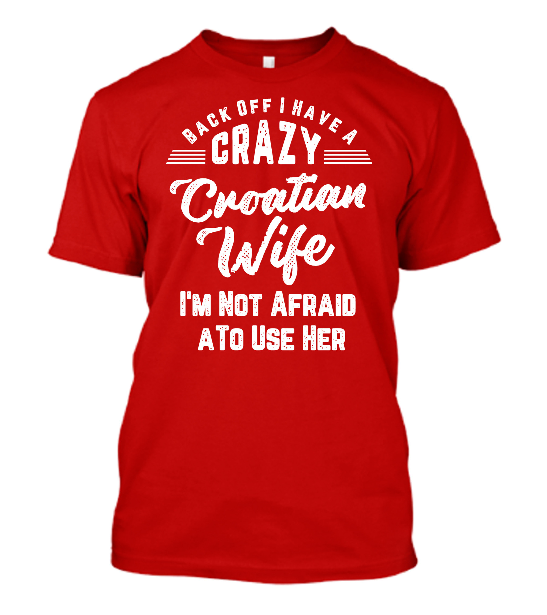 The Back Off I Have A Crazy Croatian Wife I'm Not Afraid To Use Her T-shirt is designed for everyday wear and a consistent fit. Fabric is pre-shrunk ring-spun cotton with durable stitching. See the size chart below for exact measurements.
