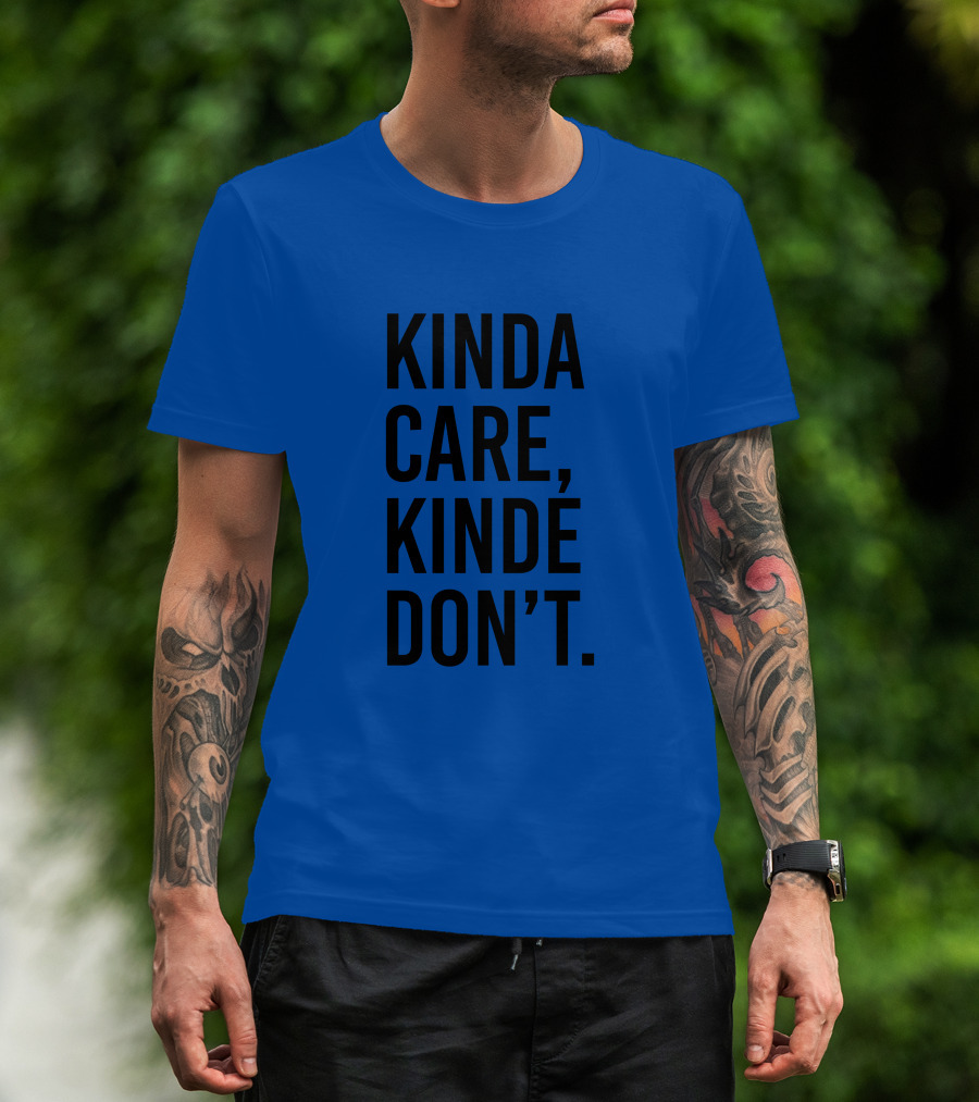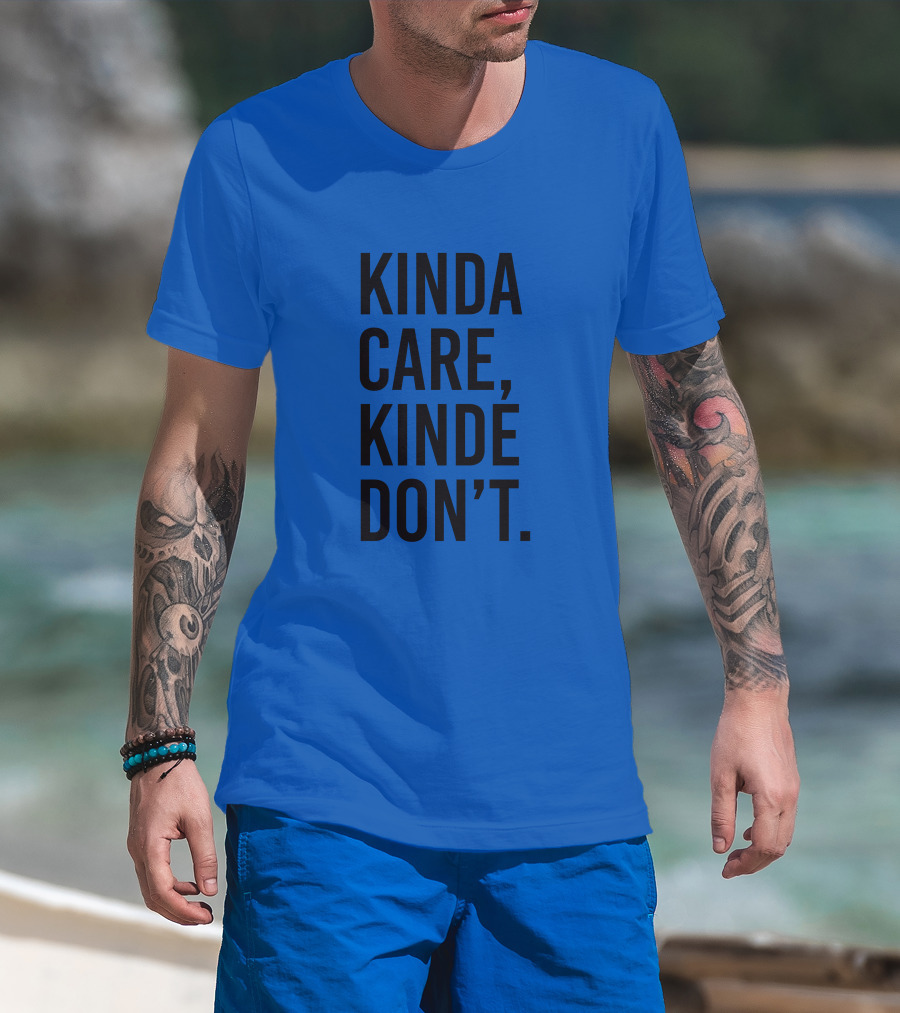 The Kinda Care Kinda Don't Text T-shirt is designed for everyday wear and a consistent fit. Fabric is pre-shrunk ring-spun cotton with durable stitching. See the size chart below for exact measurements.