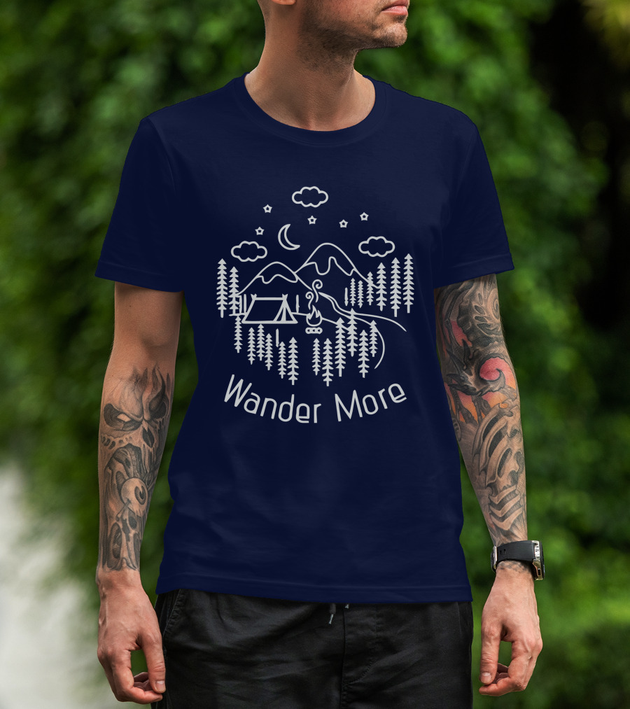 The Wander More Camping Hiking Mountain Adventure Night Sky T-shirt is designed for everyday wear and a consistent fit. Fabric is pre-shrunk ring-spun cotton with durable stitching. See the size chart below for exact measurements.