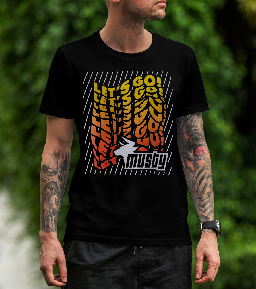 The LET'S GO Musty T-shirt is designed for everyday wear and a consistent fit. Fabric is pre-shrunk ring-spun cotton with durable stitching. See the size chart below for exact measurements.