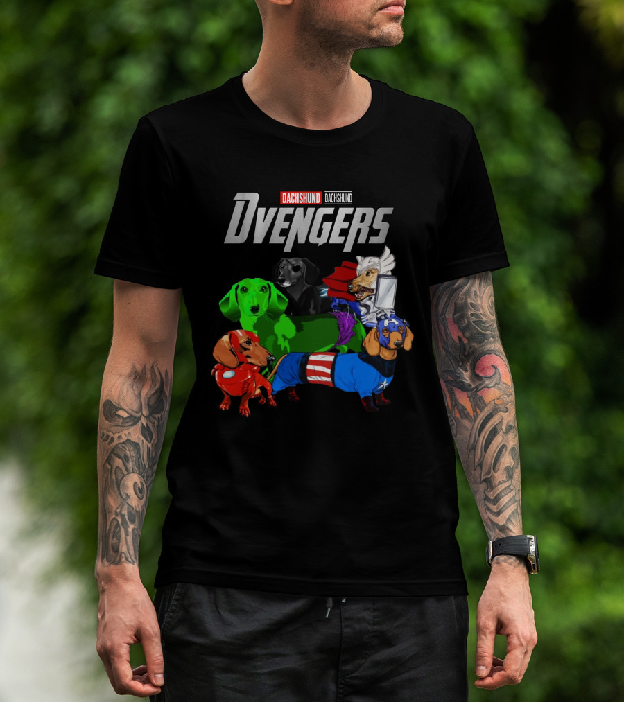The Dachshund Dachshund DVengers T-shirt is designed for everyday wear and a consistent fit. Fabric is pre-shrunk ring-spun cotton with durable stitching. See the size chart below for exact measurements.