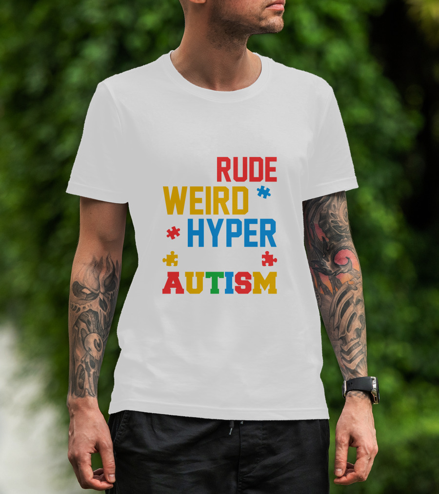 The Rude Weird Hyper Autism Puzzle Pieces T-shirt is designed for everyday wear and a consistent fit. Fabric is pre-shrunk ring-spun cotton with durable stitching. See the size chart below for exact measurements.