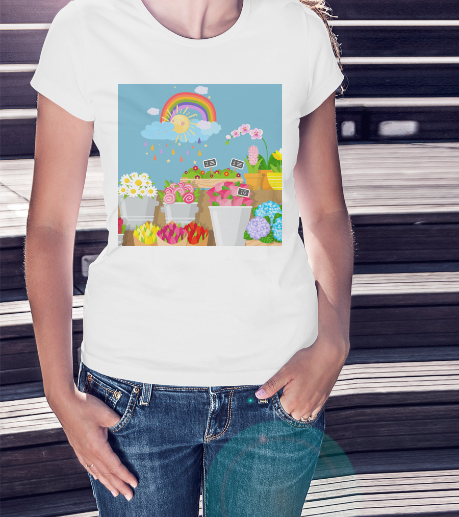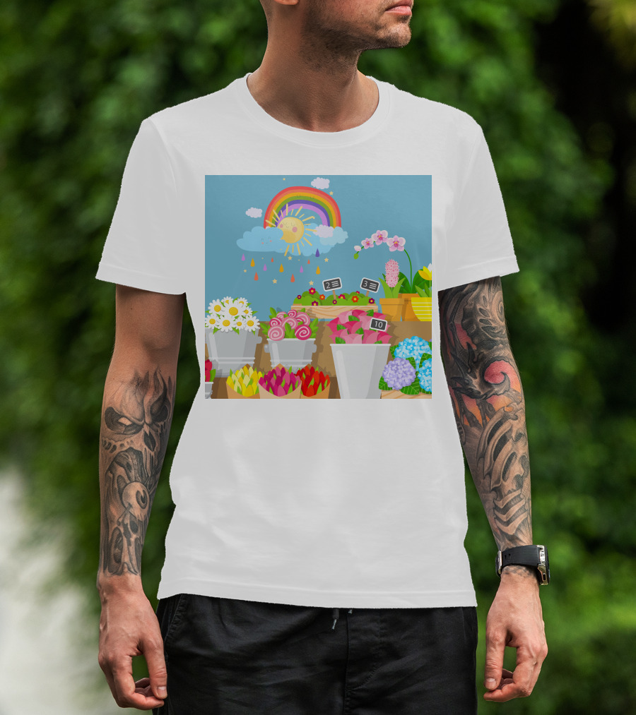 The April Showers Brings May Flowers Rainbow and Colorful Blooms Scene T-shirt is designed for everyday wear and a consistent fit. Fabric is pre-shrunk ring-spun cotton with durable stitching. See the size chart below for exact measurements.