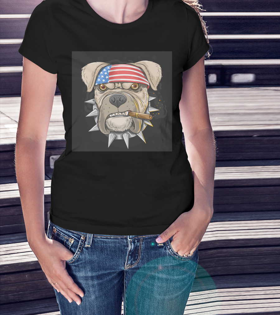 American Flag Bandana Bulldog With Cigar And Spiked Collar T-Shirt