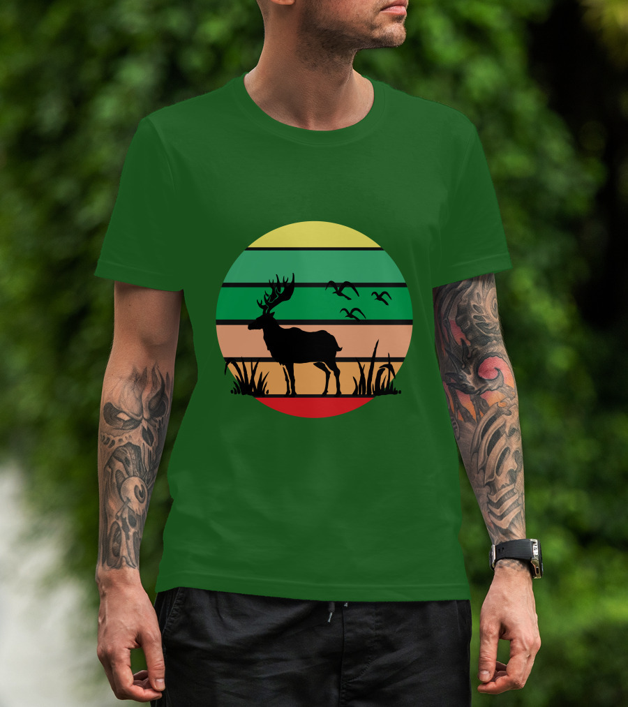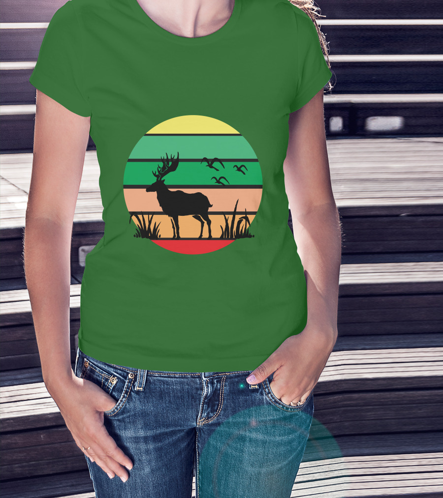 Lonely Reindeer Under The Sunset With Striped Background And Birds T-Shirt