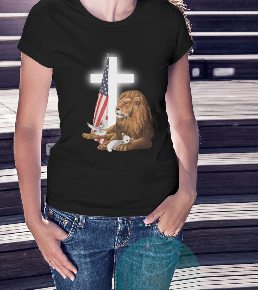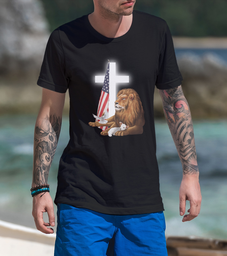 The Lion with American Flag and Cross T-shirt is designed for everyday wear and a consistent fit. Fabric is pre-shrunk ring-spun cotton with durable stitching. See the size chart below for exact measurements.