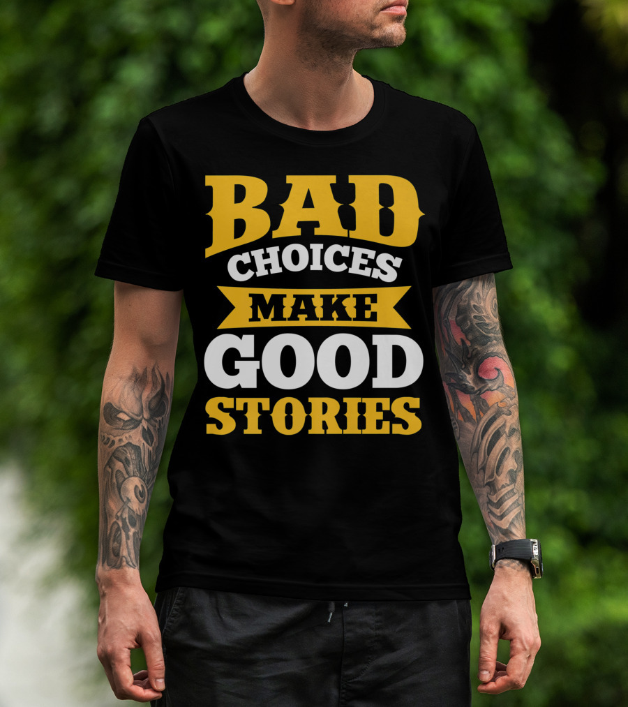 The Bad Choices Make Good Stories Sarcastic Bold Yellow T-shirt is designed for everyday wear and a consistent fit. Fabric is pre-shrunk ring-spun cotton with durable stitching. See the size chart below for exact measurements.