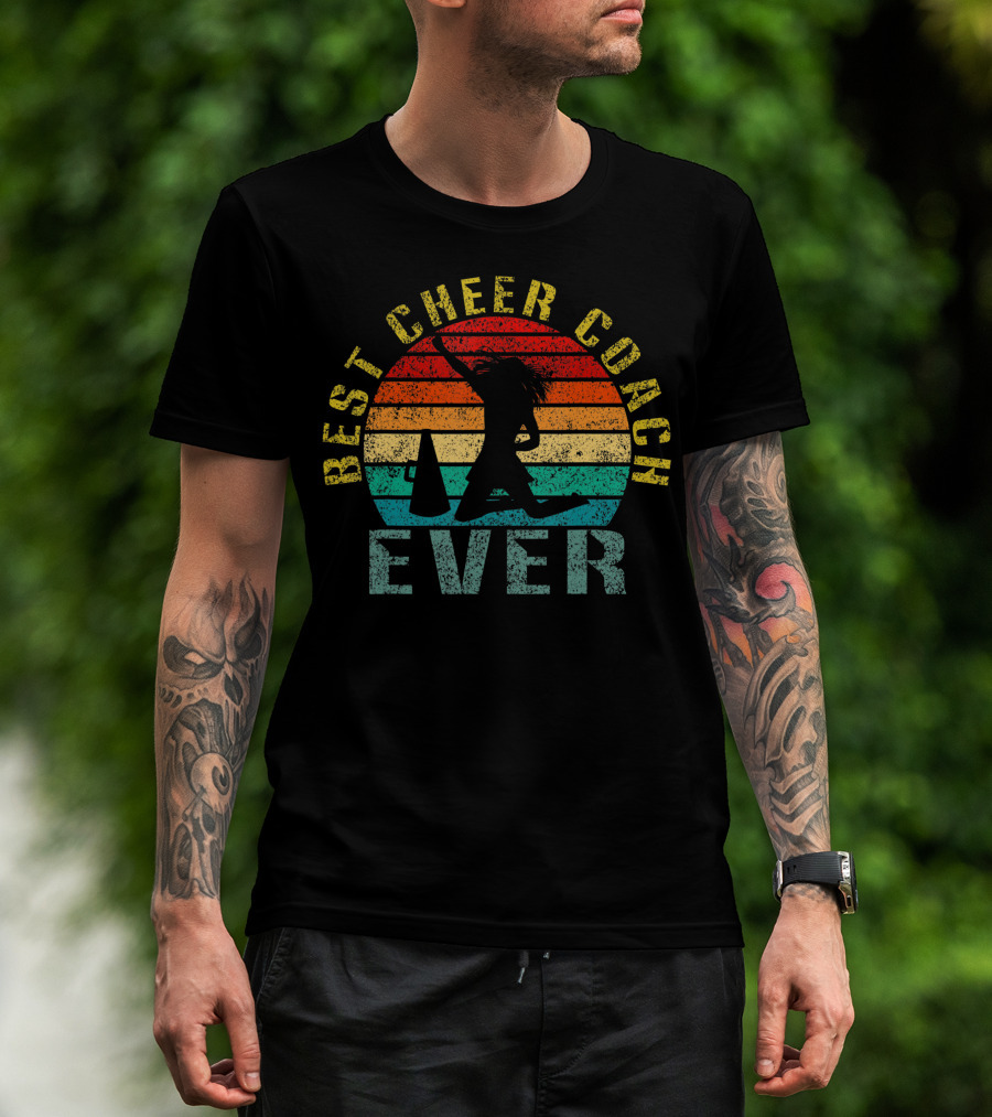 Best Cheer Coach Ever Vintage Silhouette With Megaphone And Sunset Stripes T-Shirt