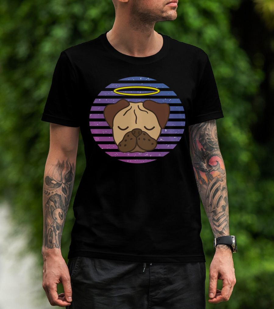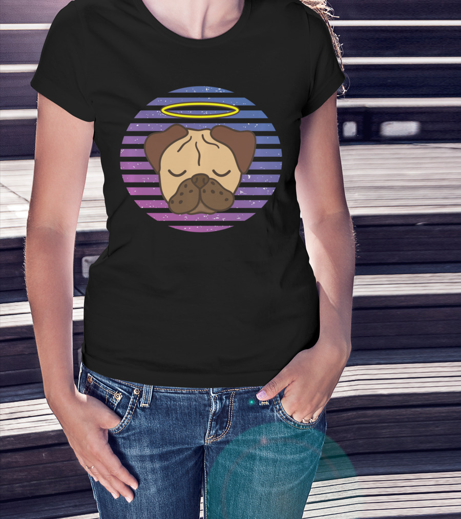 The Cute Pug Halo Retro Stripes T-shirt is designed for everyday wear and a consistent fit. Fabric is pre-shrunk ring-spun cotton with durable stitching. See the size chart below for exact measurements.