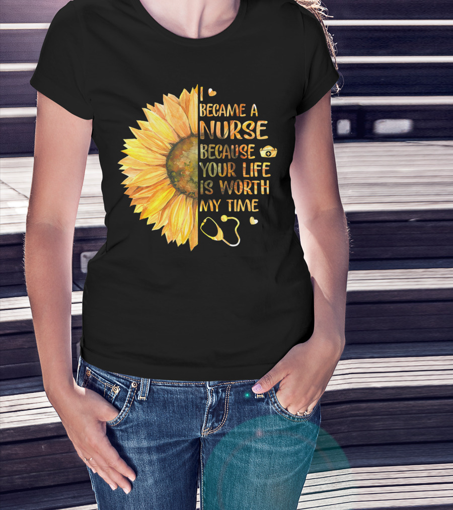 I Became A Nurse Because Your Life Is Worth My Time Sunflower Stethoscope Heart T-Shirt