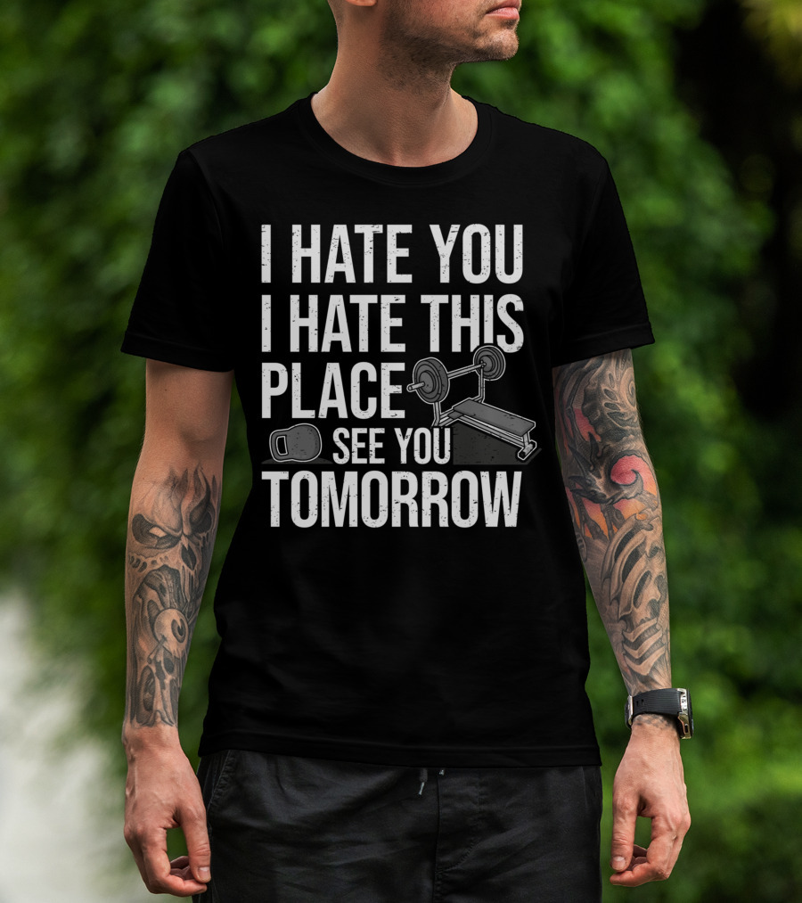 I Hate You I Hate This Place See You Tomorrow Ironic Workout Gym Sarcasm Strength Training Kettlebell T-Shirt
