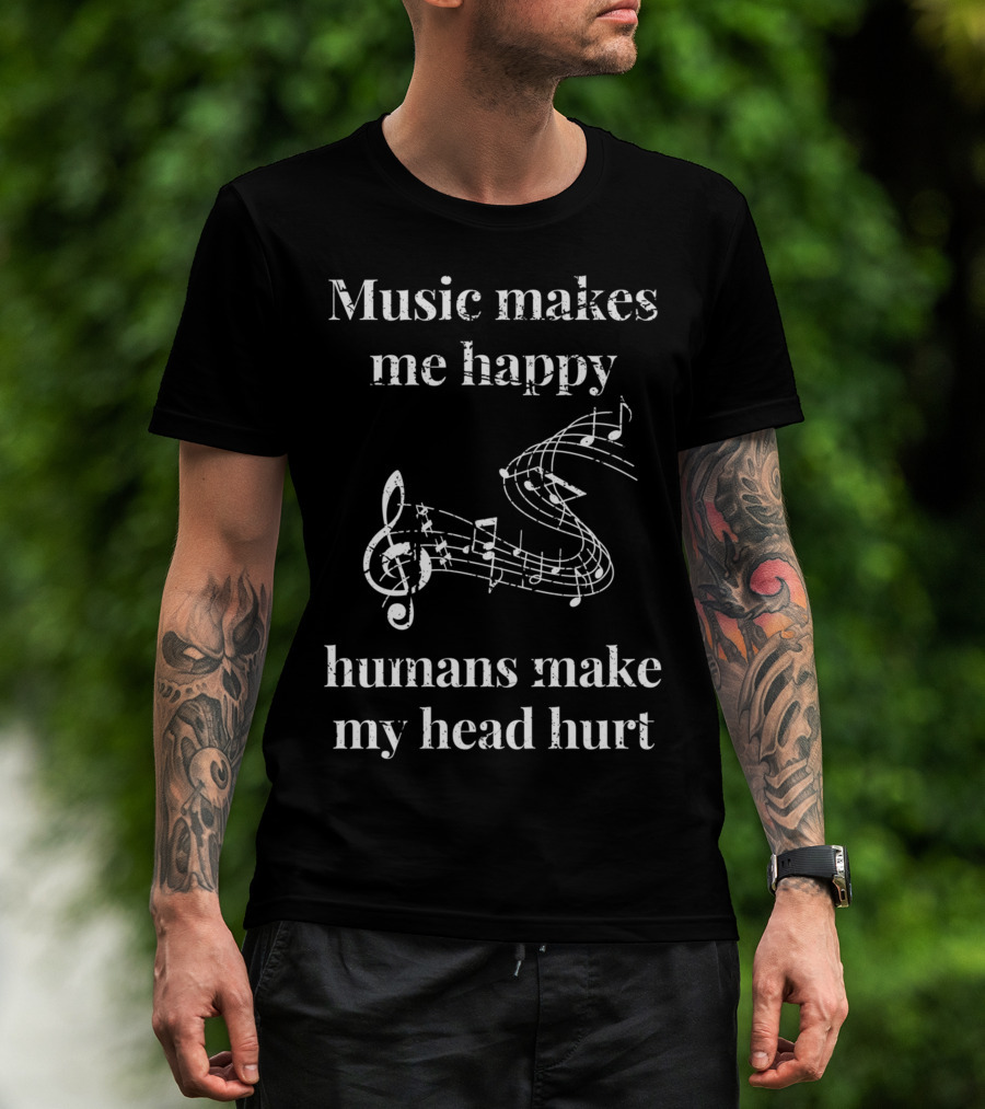 The Music Makes Me Happy Humans Make My Head Hurt Musical Notes Musicians T-shirt is designed for everyday wear and a consistent fit. Fabric is pre-shrunk ring-spun cotton with durable stitching. See the size chart below for exact measurements.